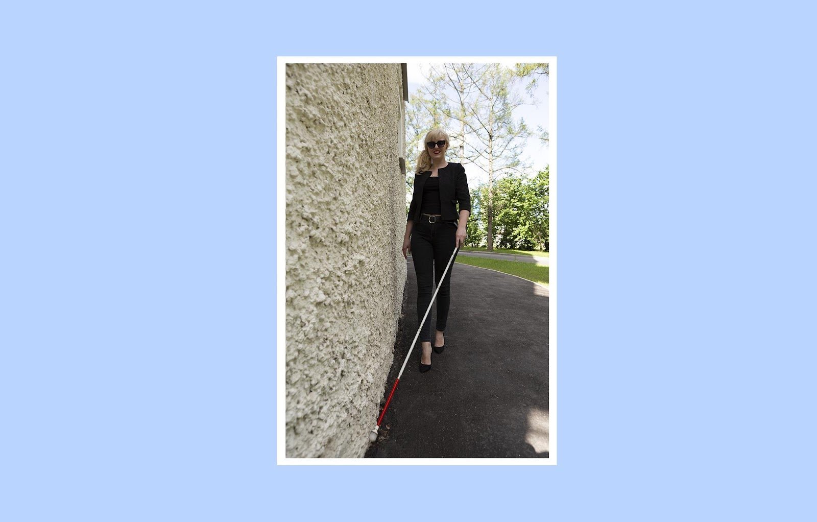 Тифлокомментарий: на голубом фоне цветная фотография в белой рамке. Солнечный день. Светловолосая стройная женщина в черных очках идет по тротуару вдоль фактурной бетонной стены. Белую трость держит по диагонали перед собой, касаясь стены. На ней черные брюки, жакет и туфли на каблуках. Это Марта Любимова. Она улыбается, волосы забраны в низкий хвост сбоку.
