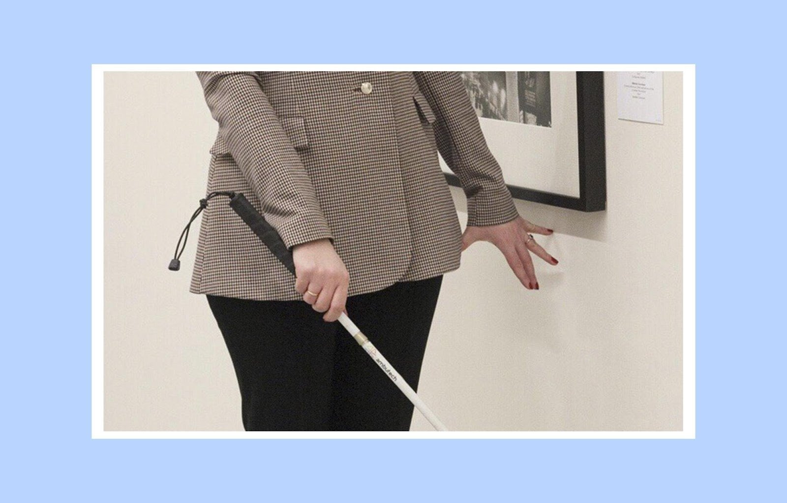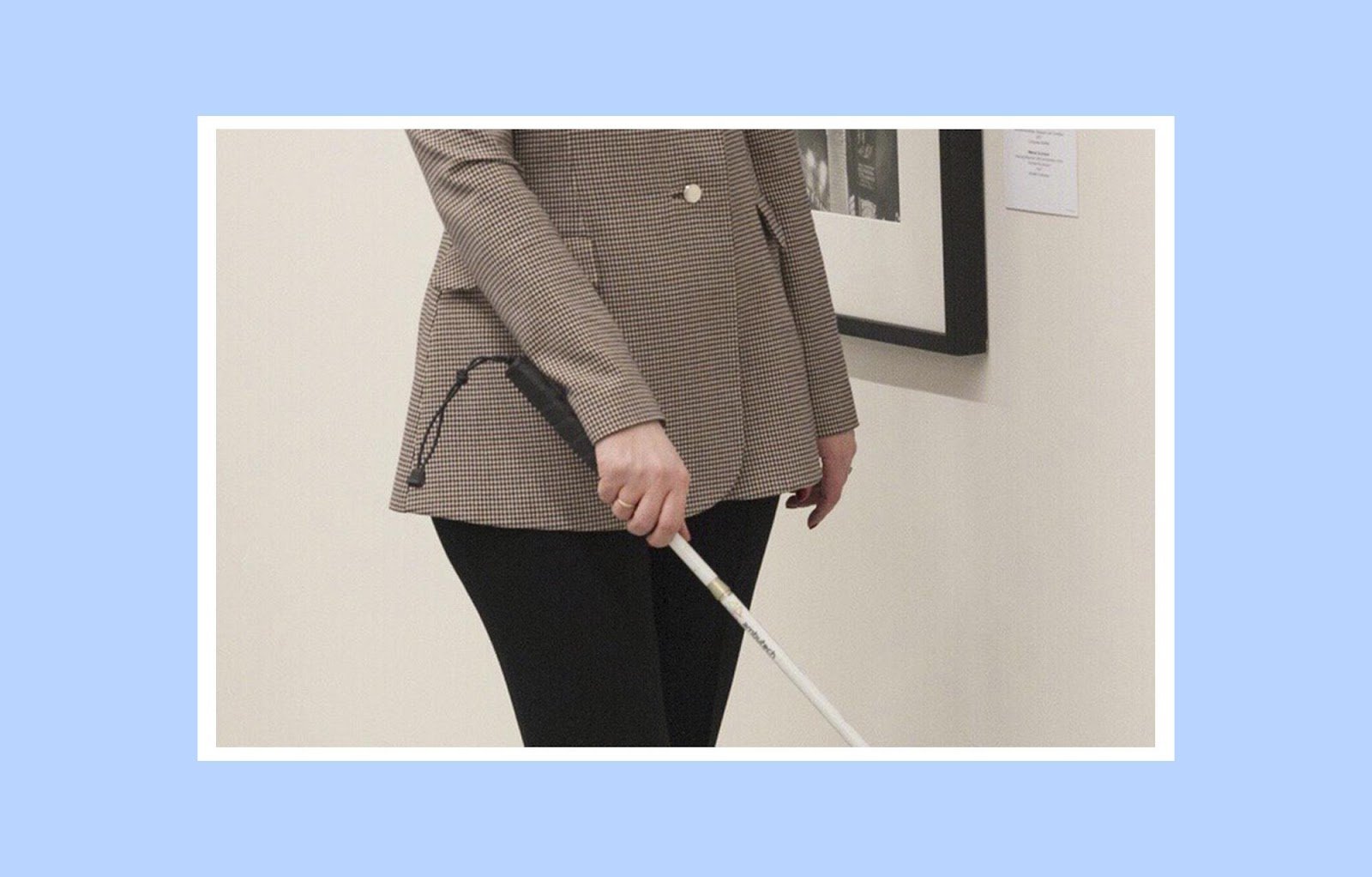Тифлокомментарий: на голубом фоне цветная фотография в белой рамке. К белой стене на небольшом расстоянии от пола прикасается белая трость с красным нижним сегментом и цилиндрическим наконечником. Рядом на светлом полу женские ноги в черных брюках и элегантных лодочках на каблуках.