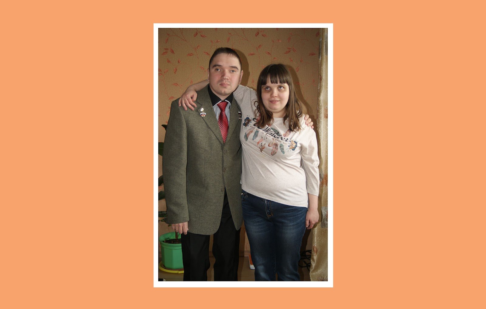 Тифлокомментарий: цветная фотография на бледно-оранжевом фоне. В комнате рядом стоят Алексей и Евгения Боровиковы. Они приобнимают друг друга за плечи. Евгения одета в джинсы и светлую футболку с рукавами, у нее темно-русые волосы по плечи с челкой и круглые черты лица. Алексей одет в черные брюки и зеленый пиджак с красным галстуком. У него короткие темно-русые волосы и небольшая щетина.
