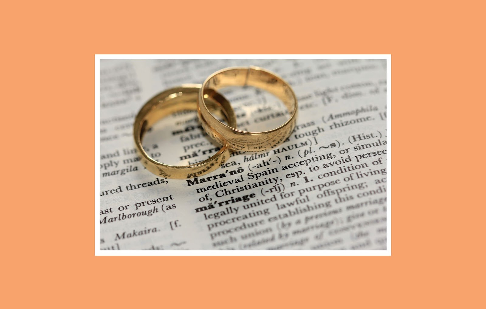 Тифлокомментарий: цветная фотография на оранжевом фоне. На странице толкового словаря английского языка лежит пара обручальных колец. Прямо под кольцами определение слова брак.