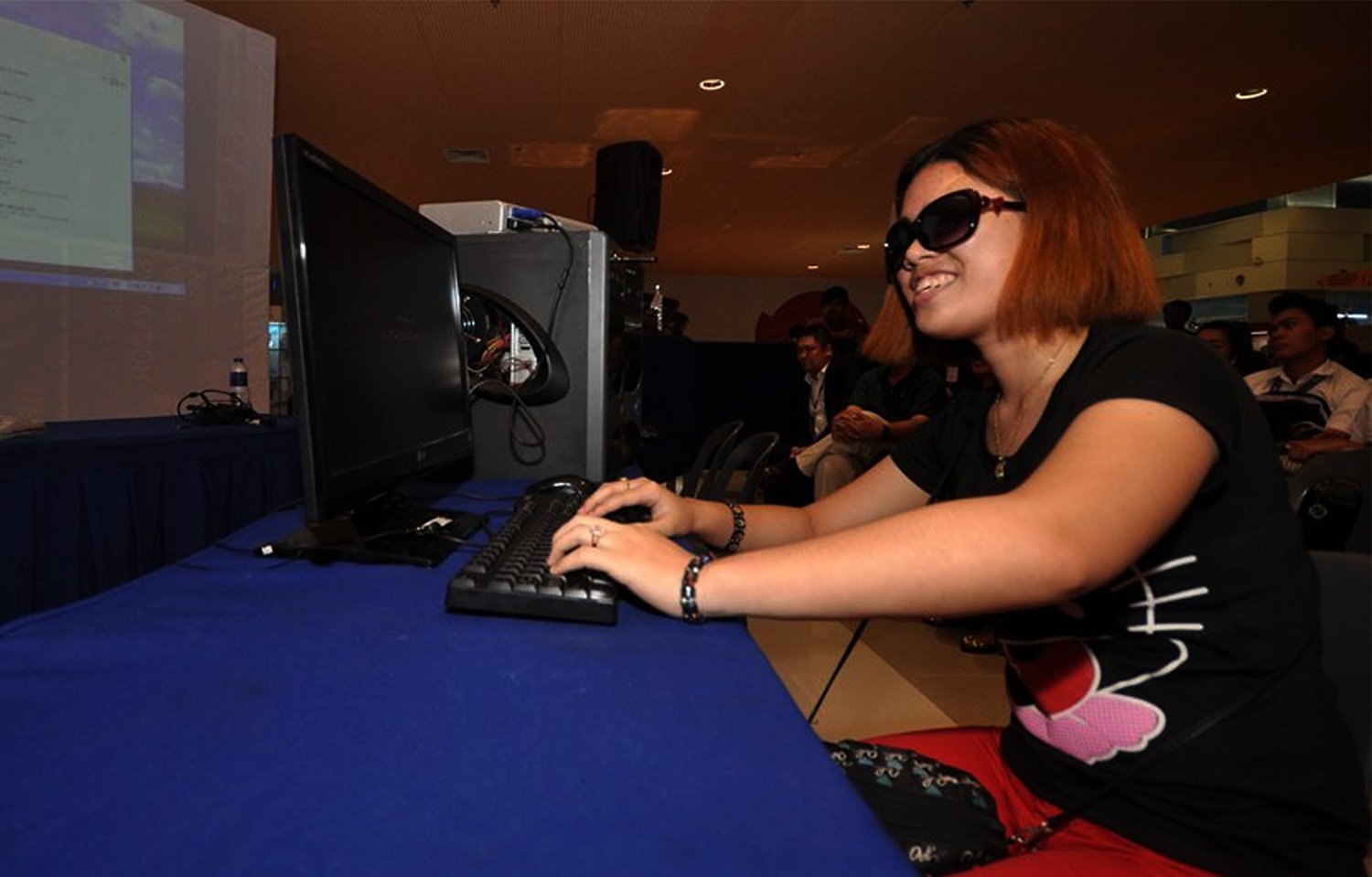 Тифлокомментарий: цветная фотография. Девушка в темных очках сидит за синим столом перед компьютером с темным монитором. Руки держит на клавиатуре. У нее рыжее каре, плотное телосложение, широкая улыбка. Одета в красные брюки, черную футболку с ярким рисунком, на обеих руках кольца и черные браслеты, на шее кулон на цепочке, на коленях лежит черная сумочка с голубым принтом и ремешком. Свет в помещении приглушен, позади сидят люди. За компьютером — большой экран, на который проецируется изображение с файловым документом.