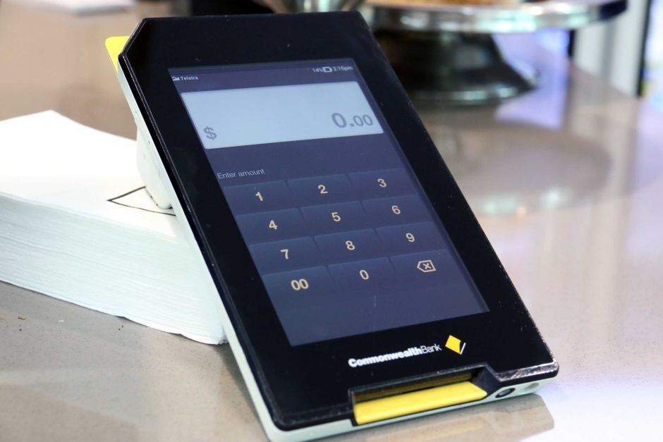 Тифлокомментарий: цветная фотография. На светлой столешнице сенсорный терминал прямоугольной формы с большим экраном и черными полями. Прислонен к стопке белых салфеток. На экране цифровая раскладка на темном фоне и белое поле для отображения введенных данных, в котором слева отображен знак доллара, а справа число 0 целых 0 сотых. Внизу устройства белая надпись Commonwealth Bank и логотип — черная трапеция в основании желтого квадрата.