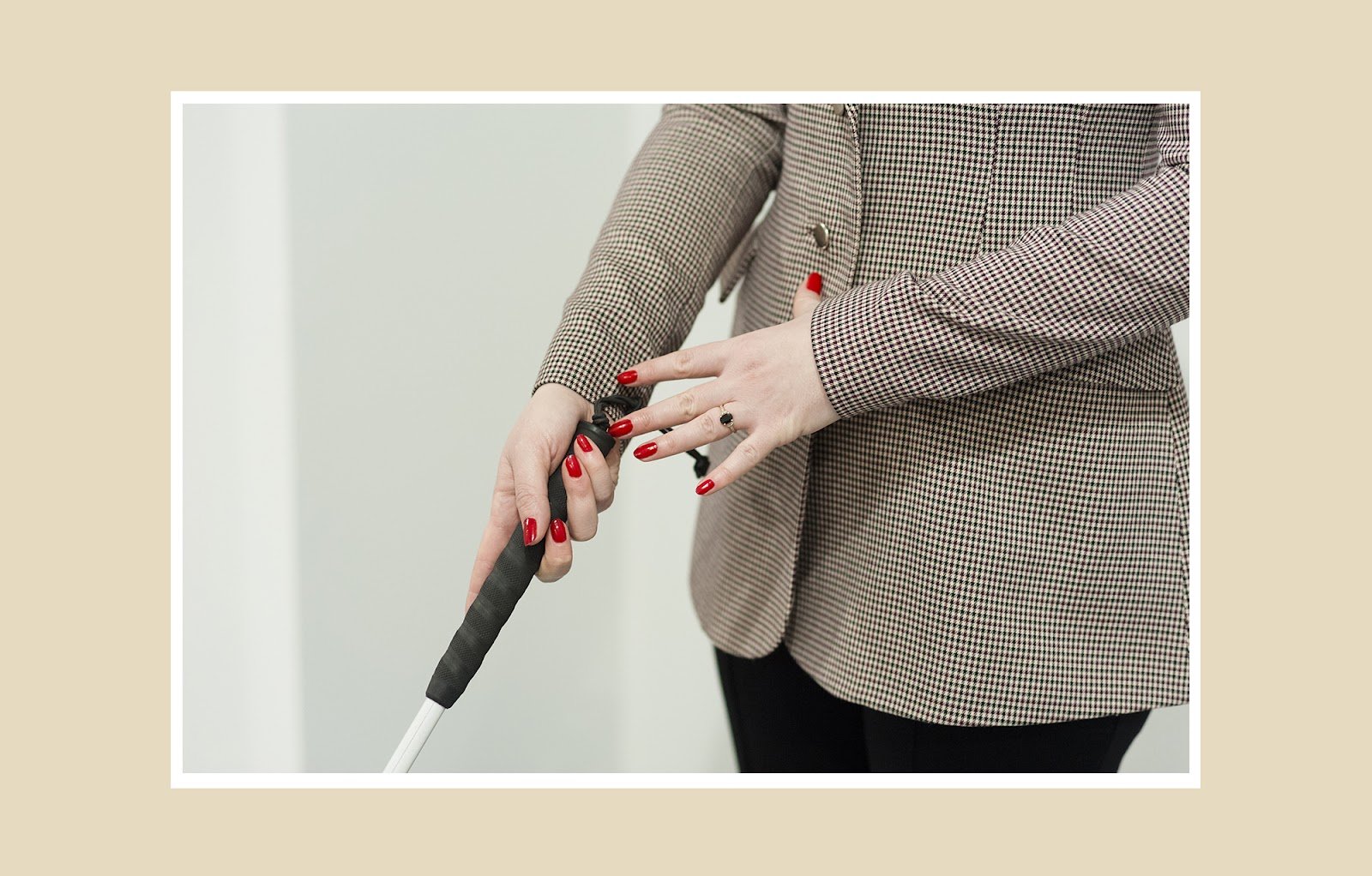 Тифлокомментарий: цветная фотография в белой рамке на бежевом фоне. Руки Марты Любимовой с ярким красным маникюром крупным планом. Ручка трости лежит в правой ладони, край ручки на уровне запястья. Прямой указательный палец лежит вдоль ручки. Большой палец охватывает трость сверху, а остальные три — снизу. Это захват «Рукопожатие».