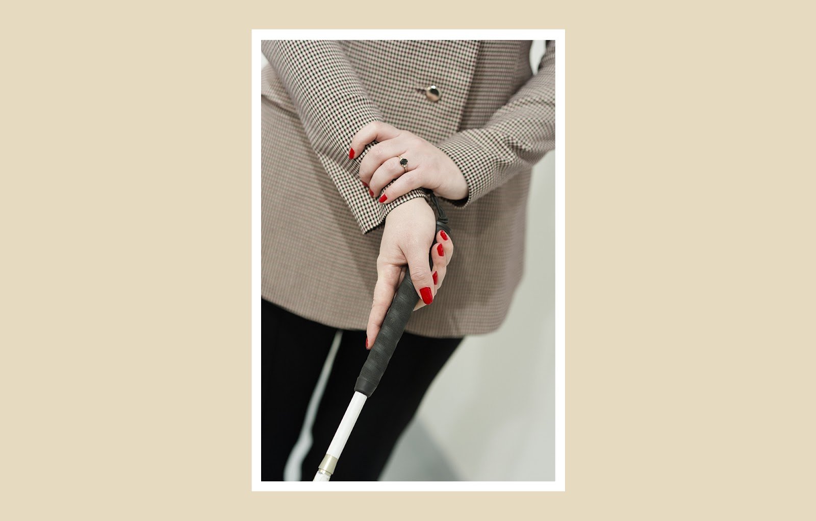 Тифлокомментарий: цветная фотография в белой рамке на бежевом фоне. Марта Любимова правой рукой держит трость, используя захват «Рукопожатие». К запястью правой руки она поднесла кисть левой руки так, что большой палец прислонен к жакету на уровне пупка, а средний — к началу трости. На безымянном пальце левой руки изысканное кольцо с крупным темным камнем овальной формы.