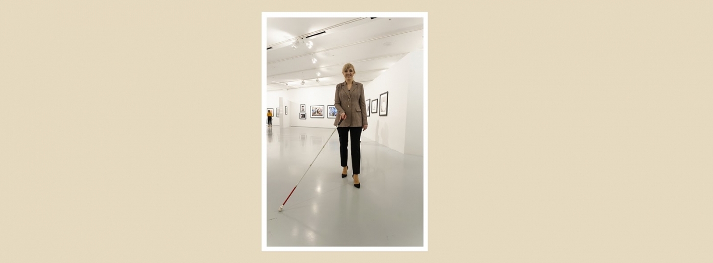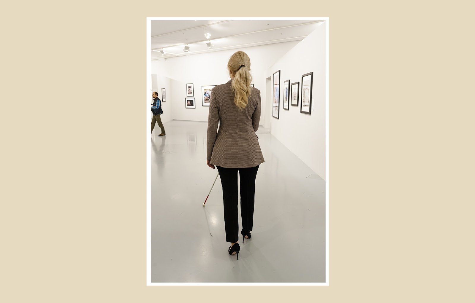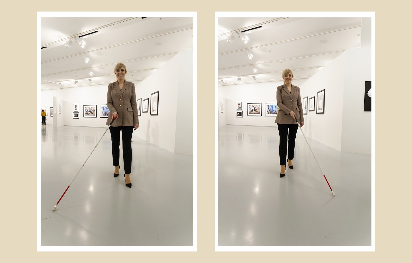 Тифлокомментарий: цветная фотография в белой рамке на бежевом фоне. Стройная женщина в черных брюках, бежевом пиджаке и элегантных черных лодочках на каблуках идет по белому залу. Это Марта Любимова. Перед собой по диагонали вправо она держит белую трость с красным нижним сегментом и цилиндрическим наконечником. Светлые волосы убраны в хвост, она улыбается. На стенах висят фотографии в черных рамках. На последующих фотографиях Марта будет в той же одежде и в том же помещении.