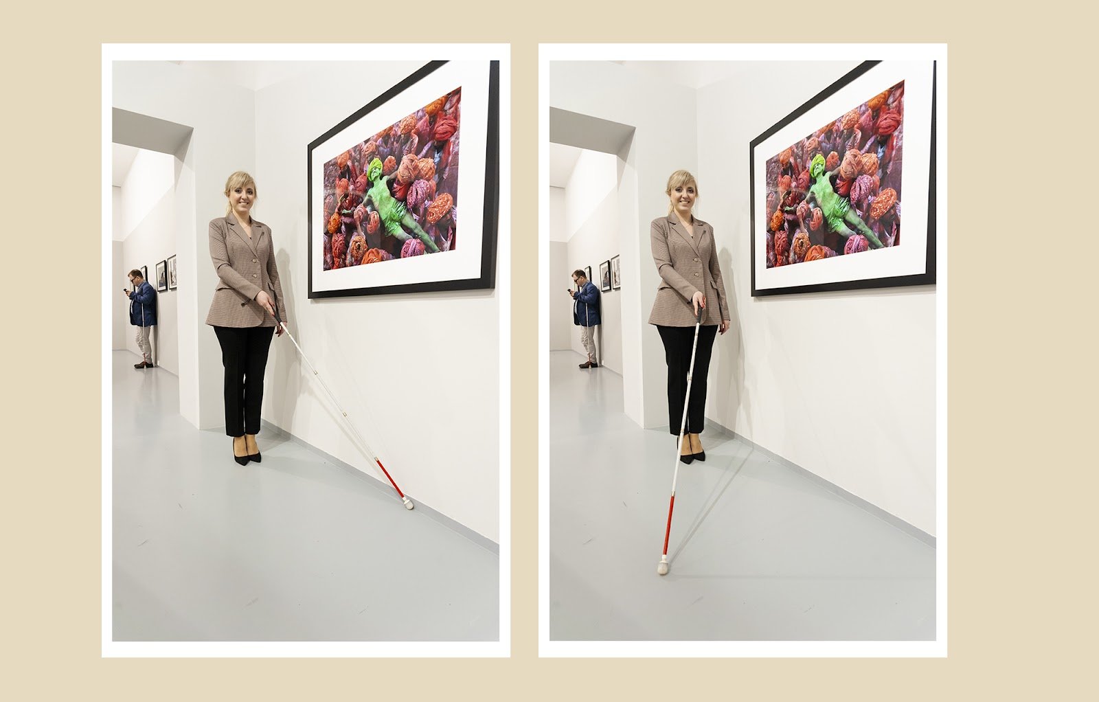 Тифлокомментарий: на бежевом фоне две цветных фотографии в белых рамках. На обеих Марта Любимова стоит у стены. На правом фото трость прикасается к белой стене у плинтуса, на левом — отведена по диагонали вправо. На стене висит фотография в черной раме: мужчины в ярких оранжевых тюрбанах подняли над головой худощавого мужчину в набедренной повязке и тюрбане. Его тело, повязка и тюрбан выкрашены ярко-зеленой краской. Чуть поодаль, прислонившись спиной к стене, стоит мужчина в черных очках и с белой тростью. На нем светлые брюки и синяя куртка.