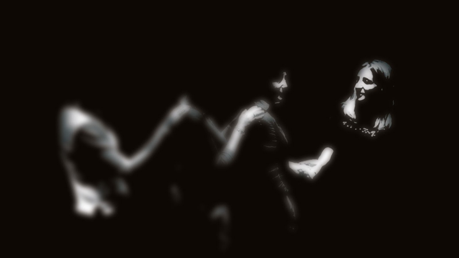 Тифлокомментарий: черно-белая фотография. На густом черном фоне размытые силуэты четырех человек. Трое из них стоят друг за другом паровозиком, положив правые руки на плечи впереди стоящих. Лицом к ним стоит девушка с распущенными волосами до плеч. Она держит за руку впереди стоящего человека, слегка улыбается.