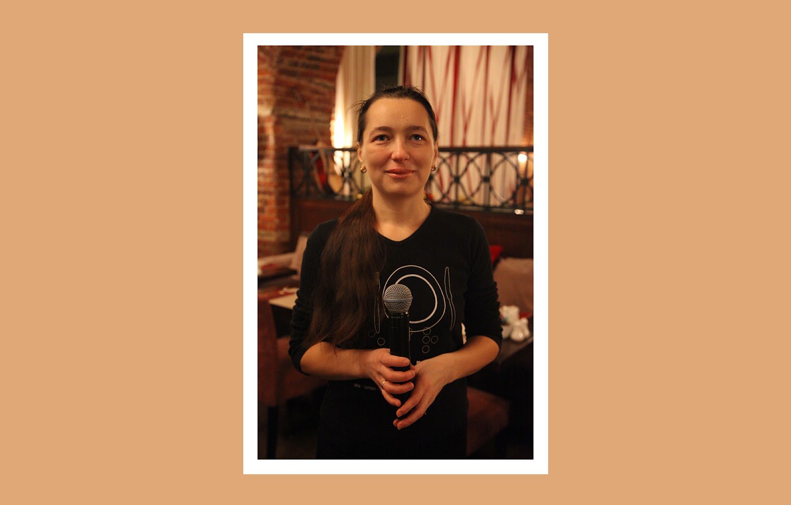 Тифлокомментарий: на оранжевом фоне цветная фотография в белой рамке. В зале ресторана стоит стройная женщина лет тридцати пяти с микрофоном в руках. Длинные темные волосы собраны в хвост, который перекинут через плечо на грудь. Это Наталья Гусева. У нее мягкие черты лица, легкая улыбка, внешние уголки глаз немного опущены. На ней черная кофта с логотипом ресторана. Стены зала из красного кирпича, элементы декора из кованого металла, плотные светлые занавески.