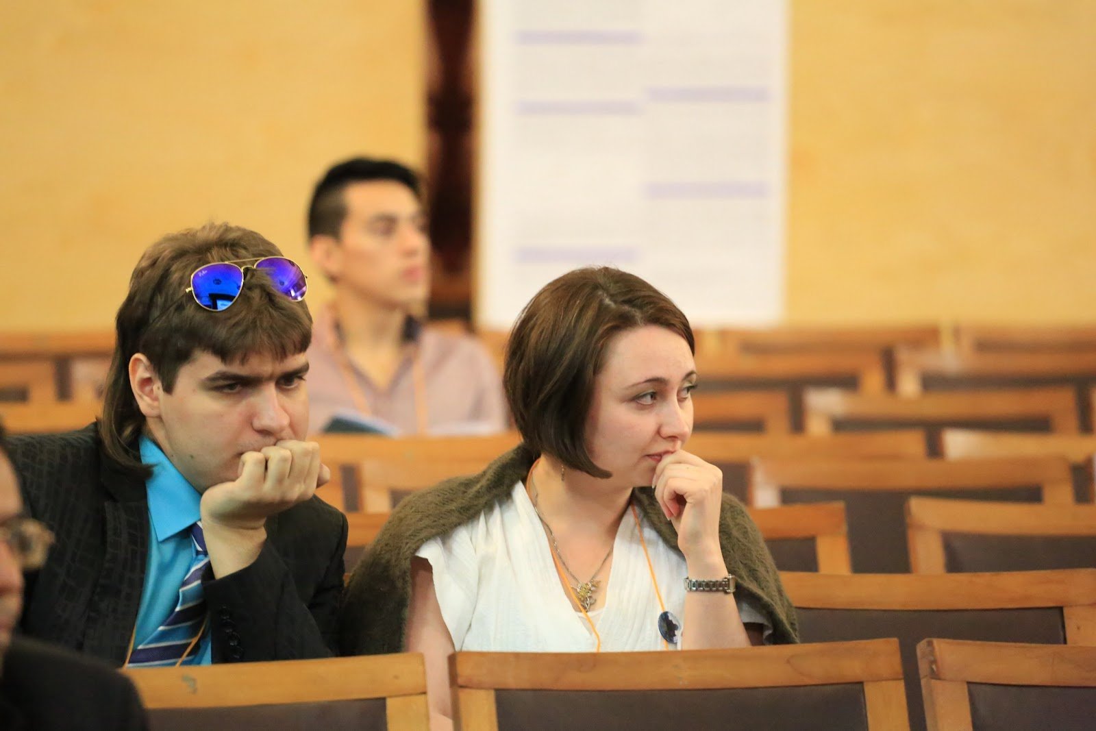 Тифлокомментарий: цветная фотография. Полупустой зрительный зал с рядами деревянных стульев с кожаной спинкой. На втором ряду сидит, подперев рукой подбородок, Виталий Вертоградов. На нем темный костюм, голубая рубашка со строгим воротничком и галстук с голубыми, белыми и фиолетовыми диагональными полосками. Его темные зеркальные очки подняты на затылок. Он, нахмурившись, задумчиво смотрит перед собой. Справа сидит молодая брюнетка с каре в белой рубашке с коротким рукавом. На ее плечи накинут шерстяной коричнево-зеленый платок. Она держит сложенную ладонь у рта и внимательно смотрит в сторону.