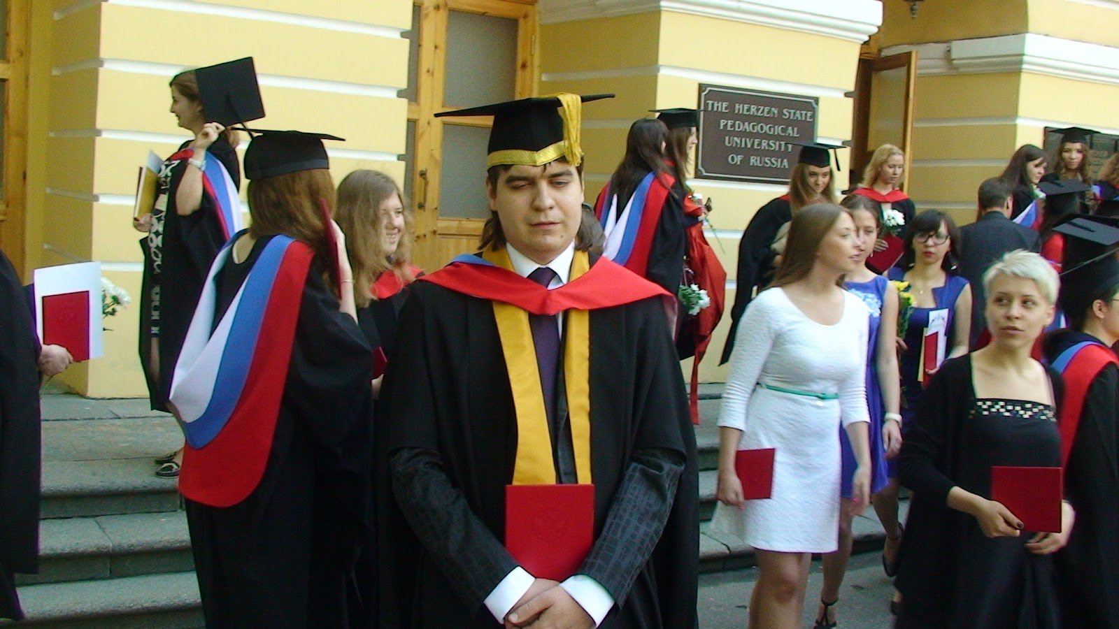 Тифлокомментарий: цветная фотография. Лестница у входа в Российский государственный педагогический университет имени Герцена. На лестнице, сложив руки на животе, стоит Виталий Вертоградов в черной мантии и шапочке бакалавра с золотой кисточкой. На плечах у него накидка в цветах российского флага. В руках он держит красный диплом. За его спиной оживленно общаются выпускники университета, на некоторых — черные мантии и шапочки бакалавров.