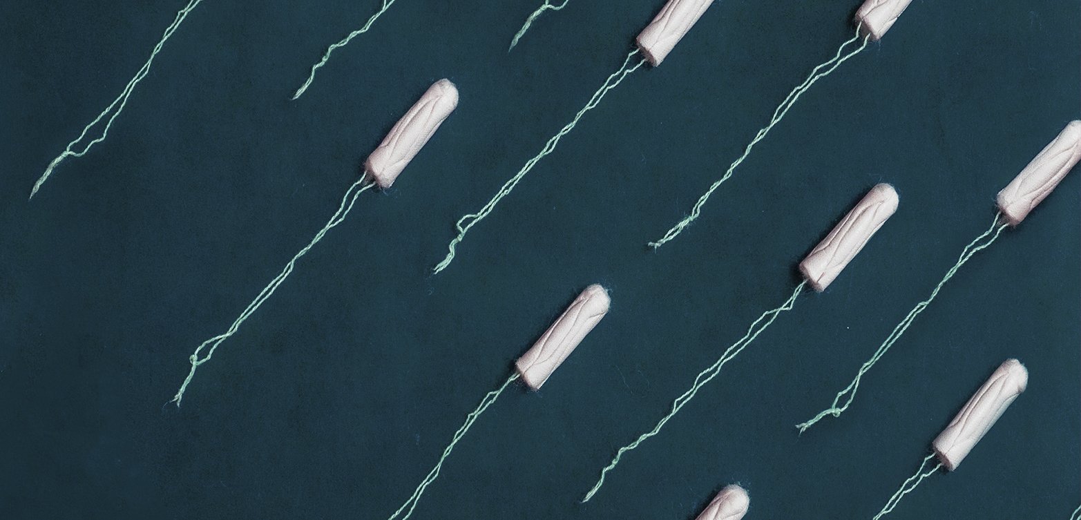 Тифлокомментарий: цветная фотография. На темно-синем фоне белые гигиенические тампоны с голубыми шнурками-аппликаторами. Тампоны расположены симметрично, в шахматном порядке.