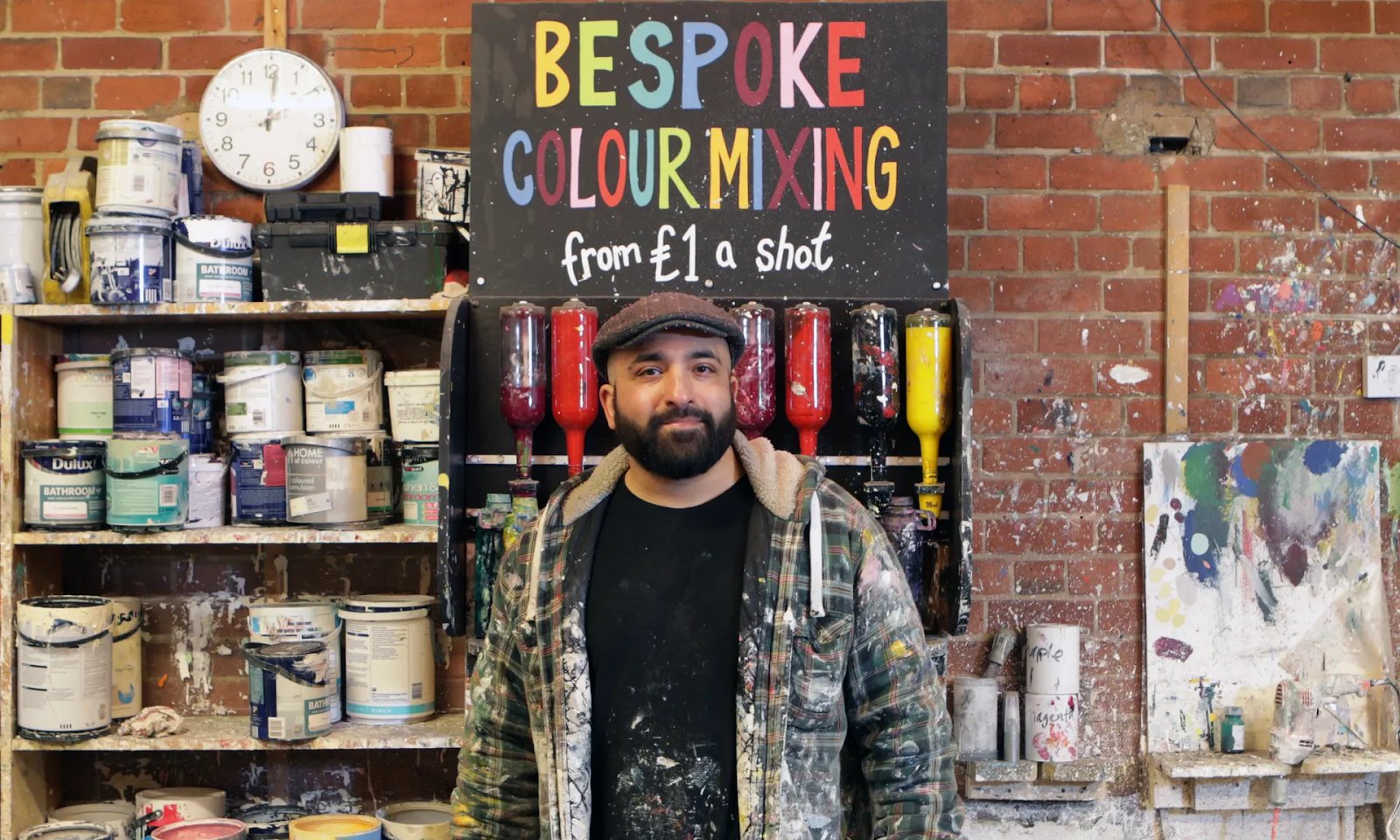 Тифлокомментарий: цветная фотография. В центре мужчина восточной внешности. У него круглое лицо, черные глаза с хитринкой, окладистая темная борода, усы. На нем черная футболка и клетчатая куртка в разноцветных пятнах – следах от краски. Наверху висит черный плакат с разноцветной надписью на английском языке: «Смешиваем краски на заказ. Цена: 1 фунт за банку». На кирпичной стене висят полки с бутылками и банками разных размеров с потеками краски.