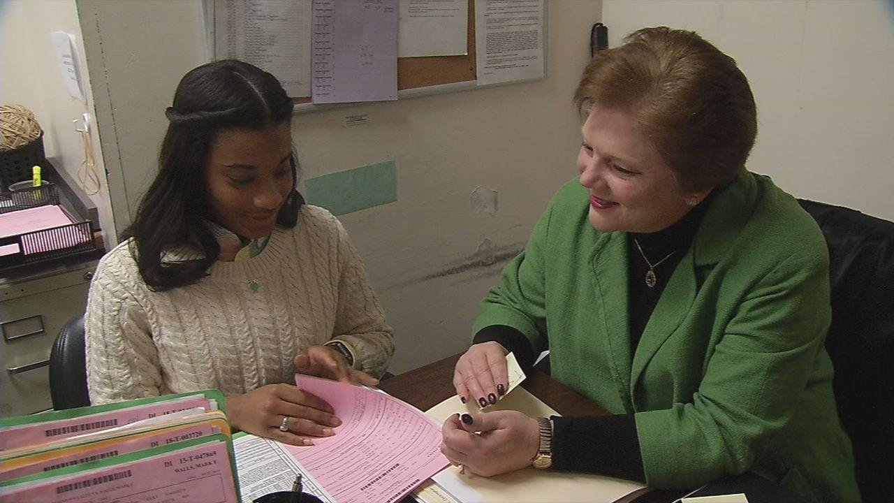 Тифлокомментарий: цветная фотография. В углу комнаты за столом с документами сидят двое. Справа женщина средних лет в зеленом пиджаке с крупными чертами лица и аккуратной стрижкой на русых волосах. С открытой улыбкой она наблюдает за действиями миловидной темнокожей девушки в белом пуловере. Ее глаза закрыты, на губах легкая улыбка, длинные пальцы осторожно перелистывают тонкую стопку документов розового цвета.