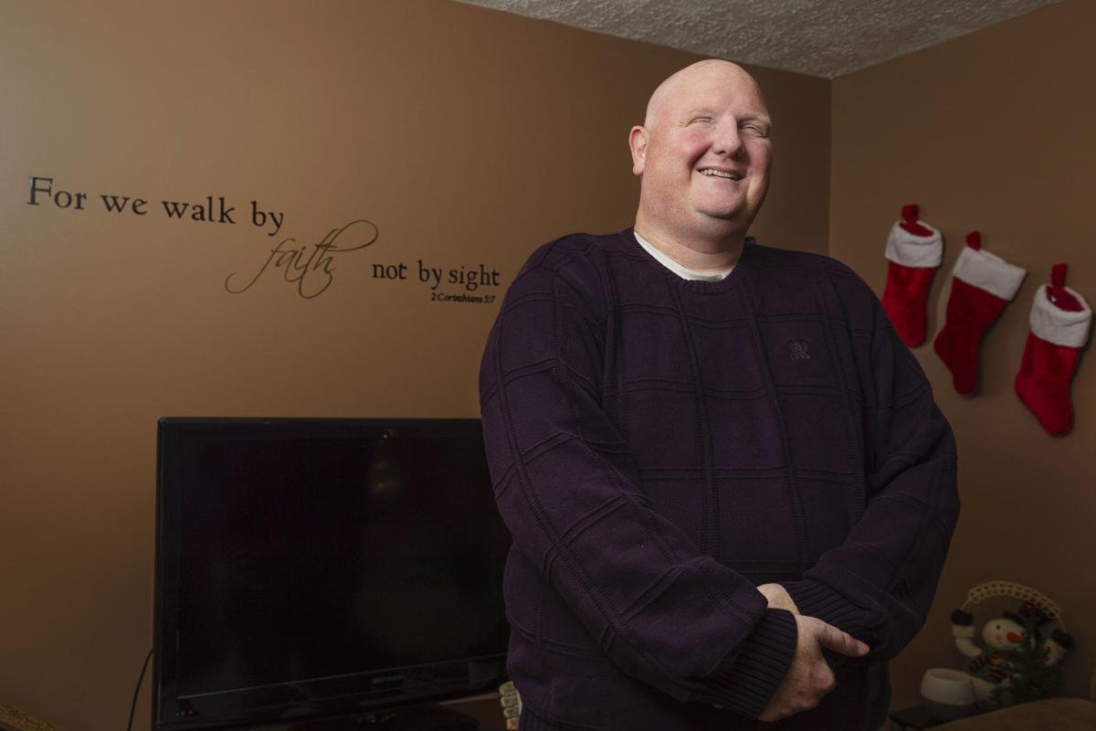 Тифлокомментарий: цветная фотография. Полный лысый мужчина в фиолетовом вязаном свитере широко улыбается. Его глаза закрыты, руки сложены на животе. Справа на стене висят красные носки для рождественских подарков. Позади мужчины стоит плазменный телевизор, на стене цитата из Библии на английском языке: «Ибо мы ходим верою, а не видением».
