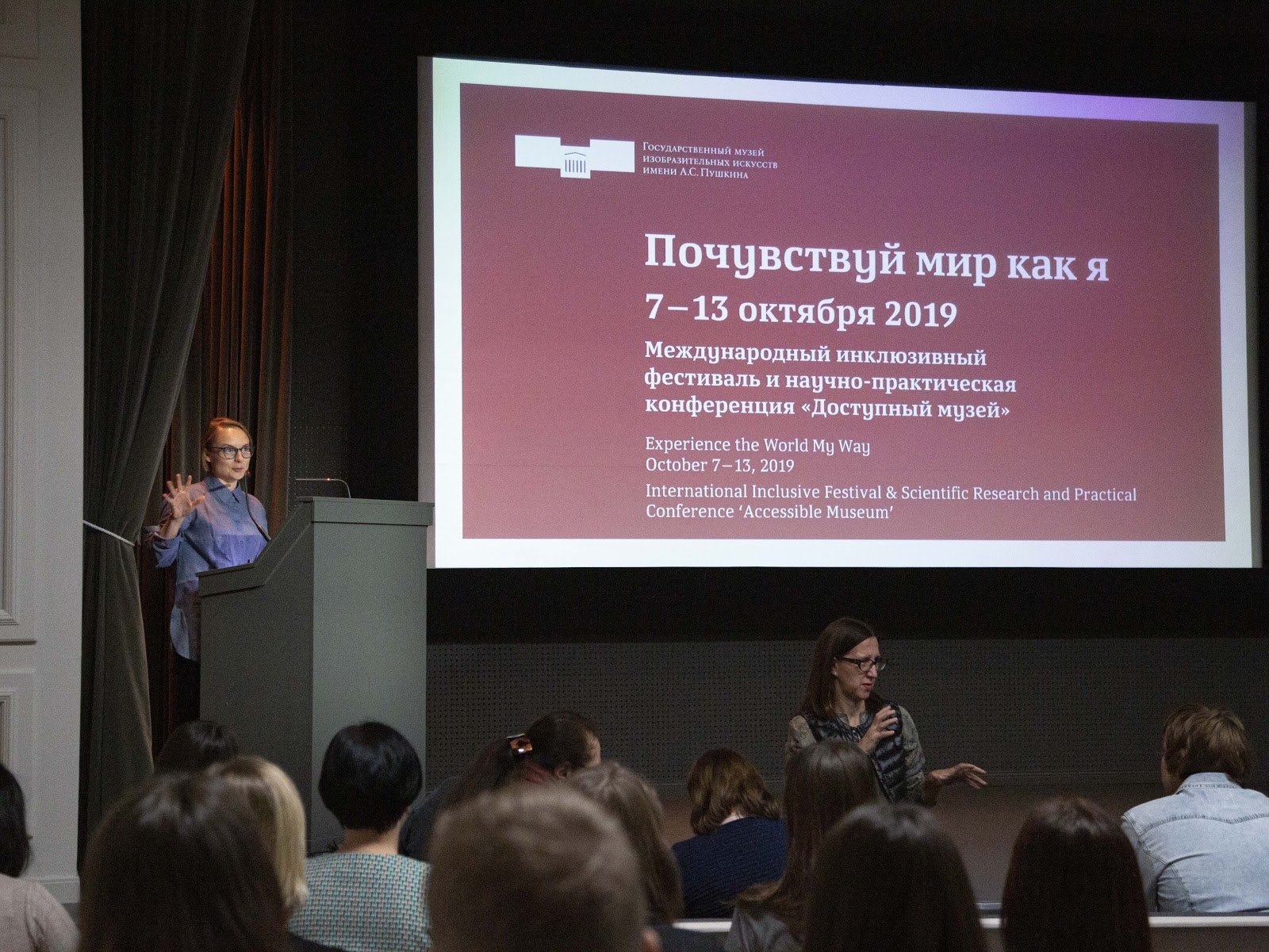 Тифлокомментарий: цветная фотография. Актовый зал. Слева на сцене за трибуной стоит молодая женщина со светлым каре в синей рубашке и очках. Она что-то рассказывает, широко растопырив пальцы правой руки. На экране слайд презентации: в белой рамке на розовом фоне логотип ГМИИ имени Пушкина и надпись: «Почувствуй мир как я. 7 – 13 октября 2019. Международный инклюзивный фестиваль и научно-практическая конференция «Доступный музей». Надпись дублирована на английском языке. Перед сценой в центре лицом к зрителям стоит брюнетка в очках – сурдопереводчик. Видны макушки зрителей на первых рядах.