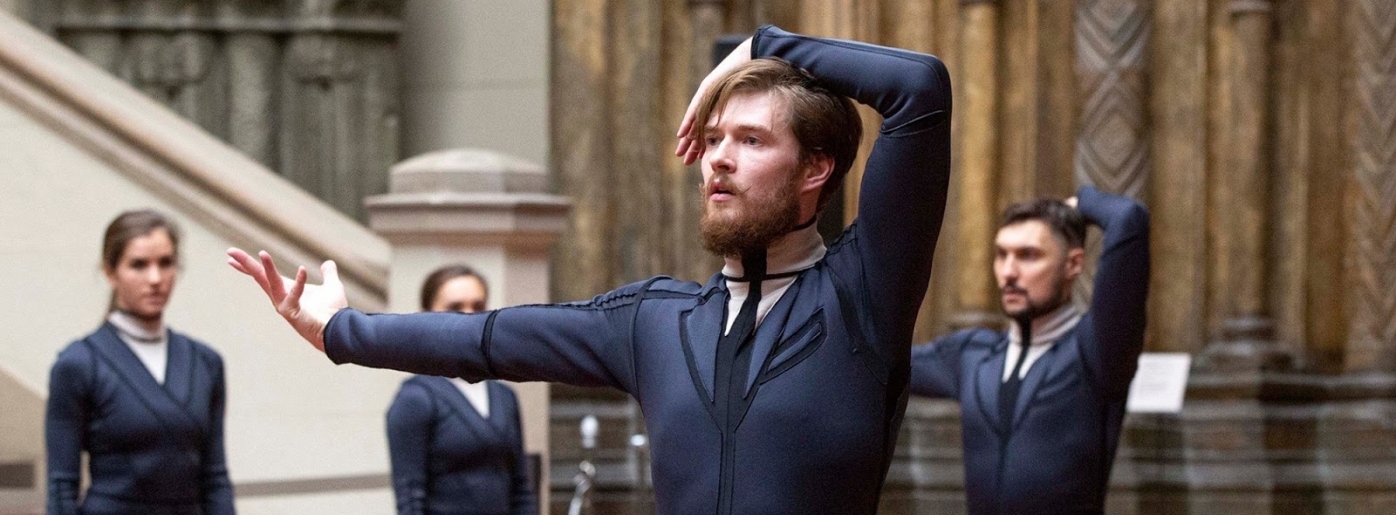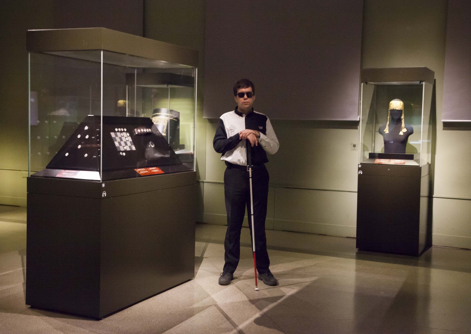 Тифлокомментарий: цветная фотография. В музейном зале между стеклянных витрин с экспонатами стоит молодой брюнет с черных очках. Прямо перед собой держит белую трость, упирает ее в пол, положив ладони на рукоять. На нем черные классические брюки, белая рубашка с черными вставками, темные ботинки. В витрине справа черный манекен верхней части туловища с золотым головным убором. В витрине слева черно-белая доска с белыми округлыми предметами. Стены помещения светло-зеленого цвета, пол бежевый. Общий свет приглушен, витрины подсвечены.