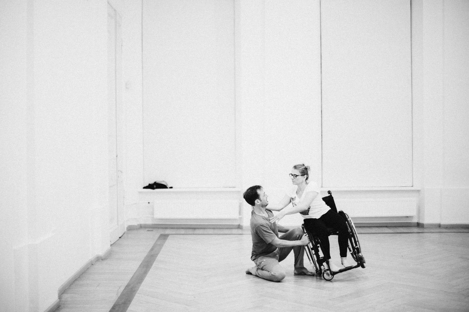 Тифлокомментарий: черно-белая фотография. В зале с белыми стенами и высоким потолком танцуют мужчина и женщина. Они одеты в спортивную одежду и танцуют босиком. Мужчина присел на правую ногу, согнутую в колене, и поставил левую ногу на пол. Его партнерша в инвалидной коляске наклонилась к нему, положив руки на плечи и балансируя на одном колесе. Мужчина держит коляску за обруч и смотрит в глаза женщине.
