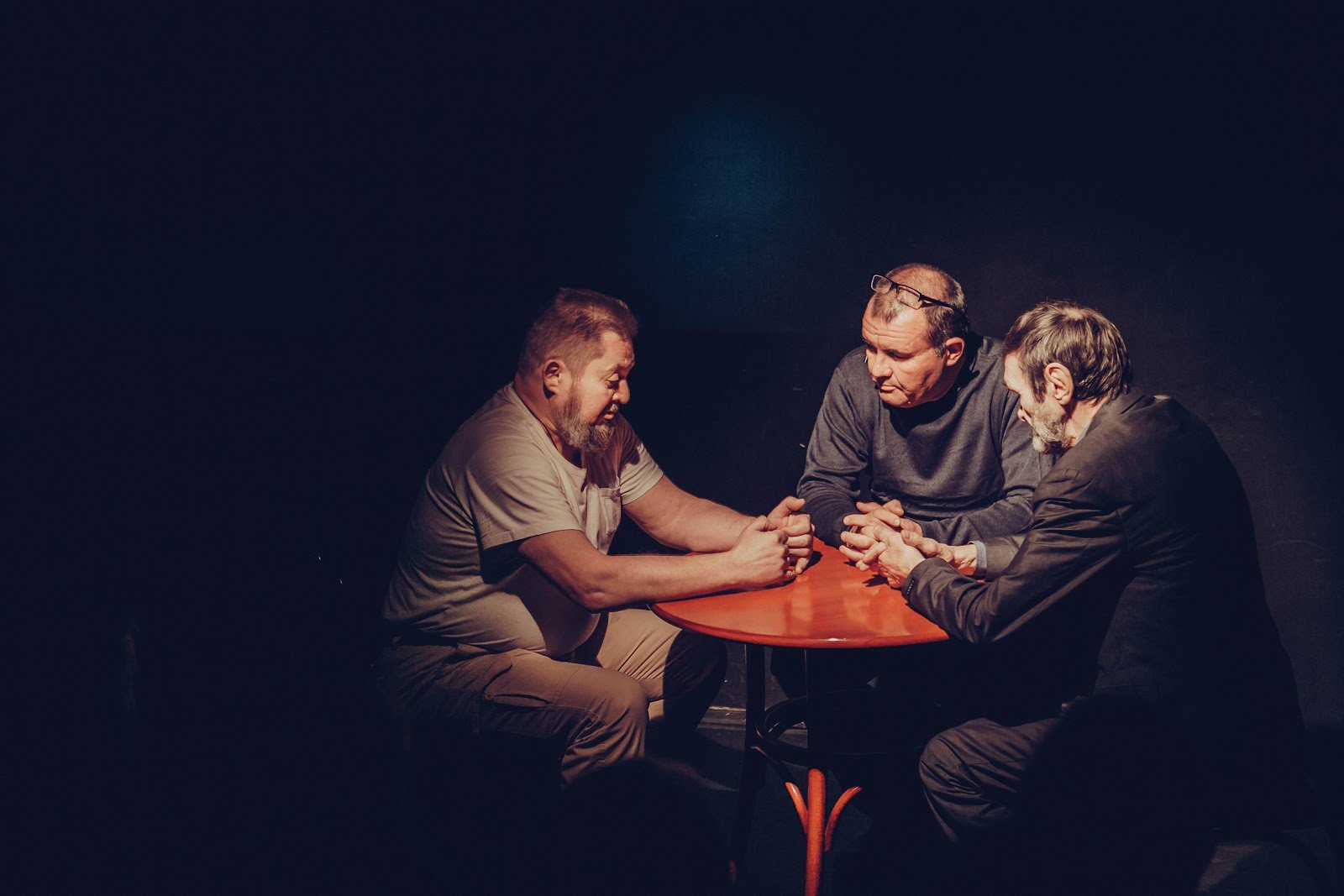 Тифлокомментарий: цветная фотография. За круглым деревянным столиком сидят трое мужчин около 50 лет. Мужчина слева с короткой стрижкой и бородой в футболке и штанах цвета хаки. Он что-то рассказывает, положив руки на стол и опустив взгляд. Остальные смотрят на него и слушают, сцепив руки в замок на столе. В центре мужчина в серой водолазке, с очками на лбу и редкими седыми волосами. Справа – в сером костюме, с короткими темными волосами и седой короткой бородой. Мужчины ярко освещены, вокруг них темнота.