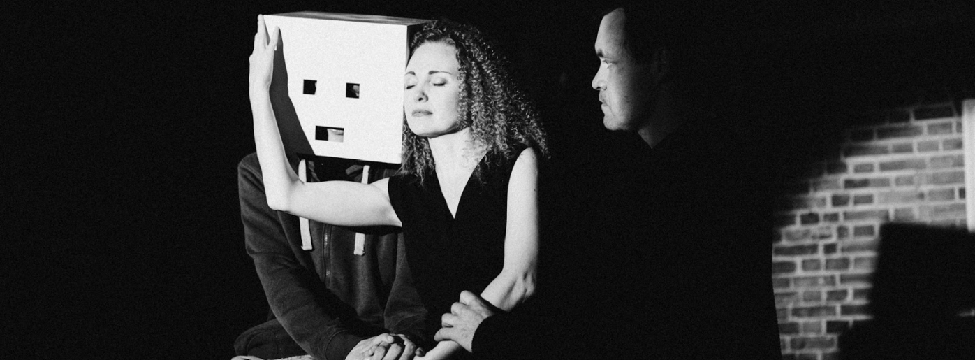 Тифлокомментарий: черно-белая фотография. В зале с белыми стенами и высоким потолком на стульях сидят мужчины и женщины в темных масках для сна на глазах. Все сосредоточенно слушают спектакль с серьезными лицами.