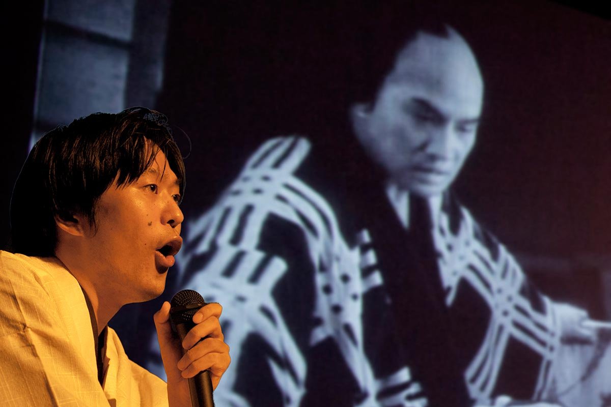 Тифлокомментарий: цветная фотография. Молодой японец говорит в микрофон, сидя боком к экрану. Нам видна только верхняя часть его корпуса. У него черные волосы, светлый наряд. На экране черно-белый кадр из фильма. Японец средних лет в темном кимоно в белую клетку стоит, положив правую руку на перила и немного наклонив голову вперед.