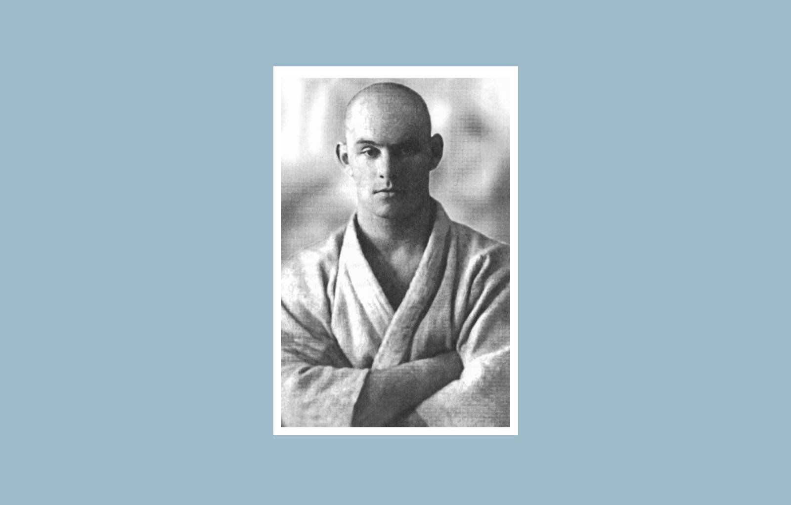 Тифлокомментарий: черно-белая фотография в белой рамке на голубом фоне. Портрет молодого мужчины спортивного телосложения в кимоно. Руки скрещены на груди, взгляд прямой, суровый. Стрижка под ноль, прямоугольная форма лица, массивная шея.