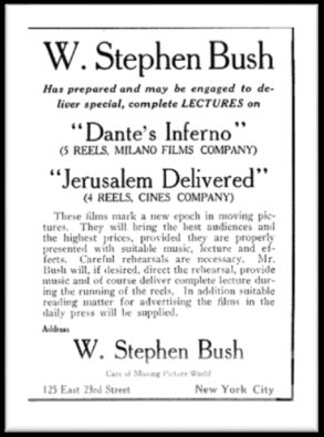 Объявление о кинопоказе с «лекциями» Стивена Буша, журнал The Moving Picture World, 1908 год