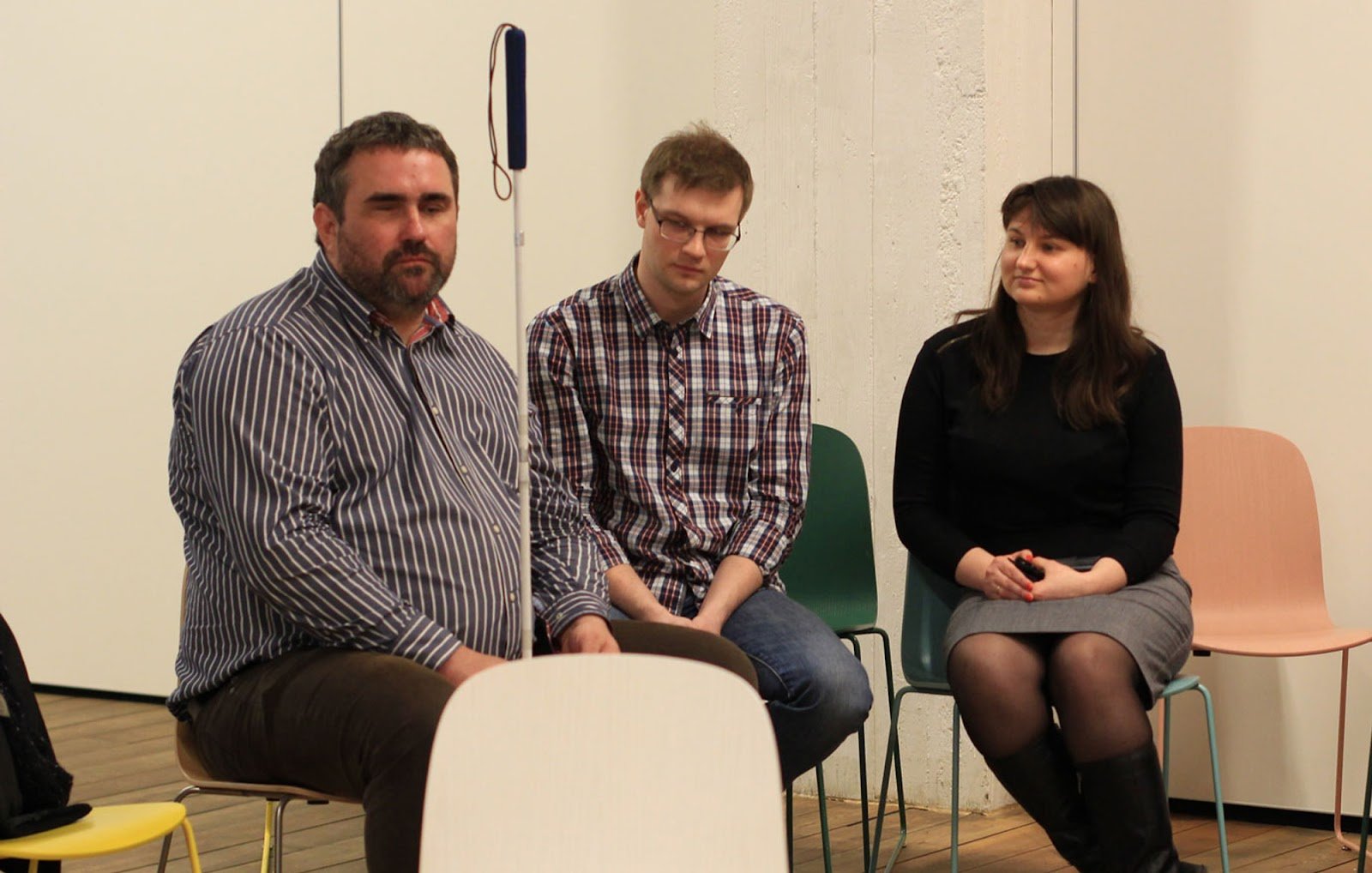 Тифлокомментарий: цветная фотография. В помещении с белыми стенами на стульях сидят трое. Слева Олег Колпащиков — мужчина крупного телосложения с короткими темными волосами и щетиной. Он одет в джинсы и рубашку в бело-синюю полоску. Он поставил белую трость вертикально перед собой и придерживает ее рукой. Рядом сидит Игорь Новиков — стройный молодой мужчина с короткой стрижкой в очках, джинсах и клетчатой рубашке. Справа сидит Елена, она смотрит в сторону Олега с легкой улыбкой, сложив руки на коленях. У Елены длинные темные прямые волосы с челкой, она одета в черную водолазку, серую юбку до колен и черные сапоги, на руках аккуратный красный маникюр.