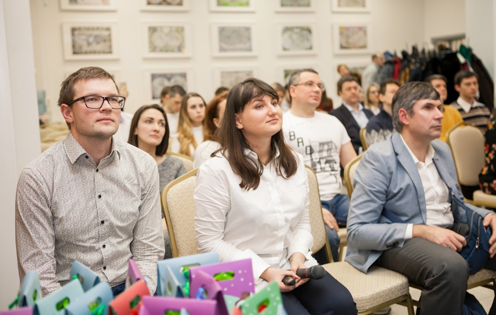 Тифлокомментарий: цветная фотография. Люди сидят на стульях в зале с белыми стенами. Игорь, Елена и Сергей сидят в первом ряду и внимательно слушают, глядя на сцену. Игорь в светло-серой рубашке, Елена в белой, с пультом и микрофоном в руках. Сергей в белой рубашке, голубом пиджаке и серых брюках держит на коленях небольшой рюкзак. Люди за ними также слушают выступление на сцене. На столе перед Игорем стоят разноцветные подарочные пакеты. На стене висят ряды изображений в белых рамках, у входа в зал стоит вешалка с верхней одеждой.