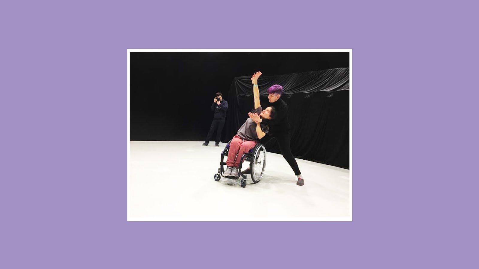 Тифлокомментарий: цветная фотография на фиолетовом фоне. В комнате с белым полом и черными стенами Ирина Поволоцкая танцует в паре с девушкой на инвалидной коляске. Поодаль стоит фотограф и снимает танец. Ирина одета в черную водолазку и брюки, ее партнерша в розовых джинсах и серой футболке. Ирина стоит позади коляски, широко расставив ноги и склонившись в сторону. Она держит партнершу за руки и как бы управляет ими. Правую руку девушки она вытянула вверх, левую согнула в локте и держит на уровне груди.