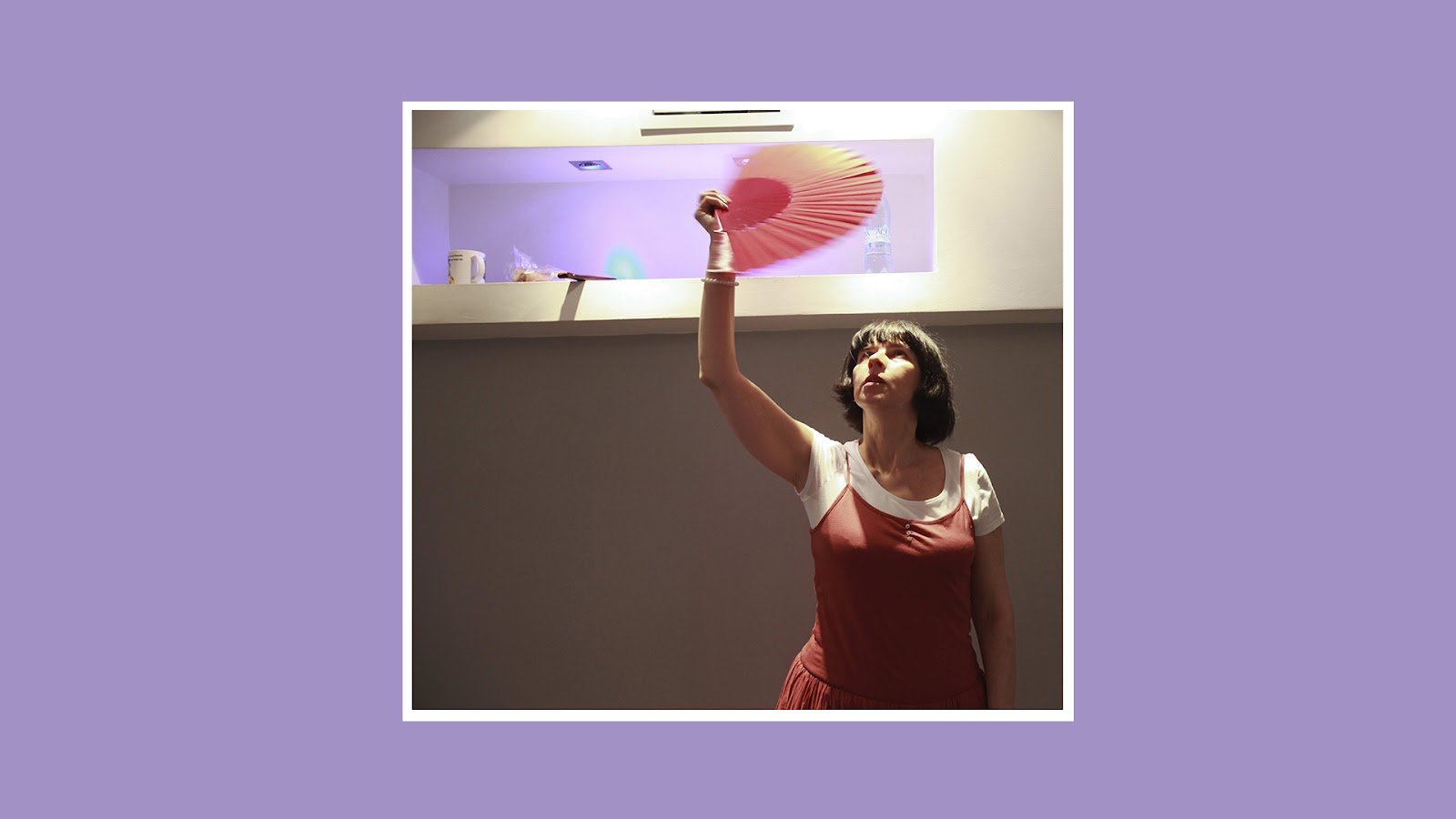 Тифлокомментарий: цветная фотография на фиолетовом фоне. Ирина Поволоцкая танцует с красным веером в помещении с серыми стенами. Ирина одета в белую футболку и красное платье на тонких бретелях поверх футболку, у нее темные волосы по плечи с челкой. Она поднимает правую руку вверх с распахнутым веером и смотрит на него. Сверху на нее падает свет, оставляя контрастные тени на лице, плечах и груди.