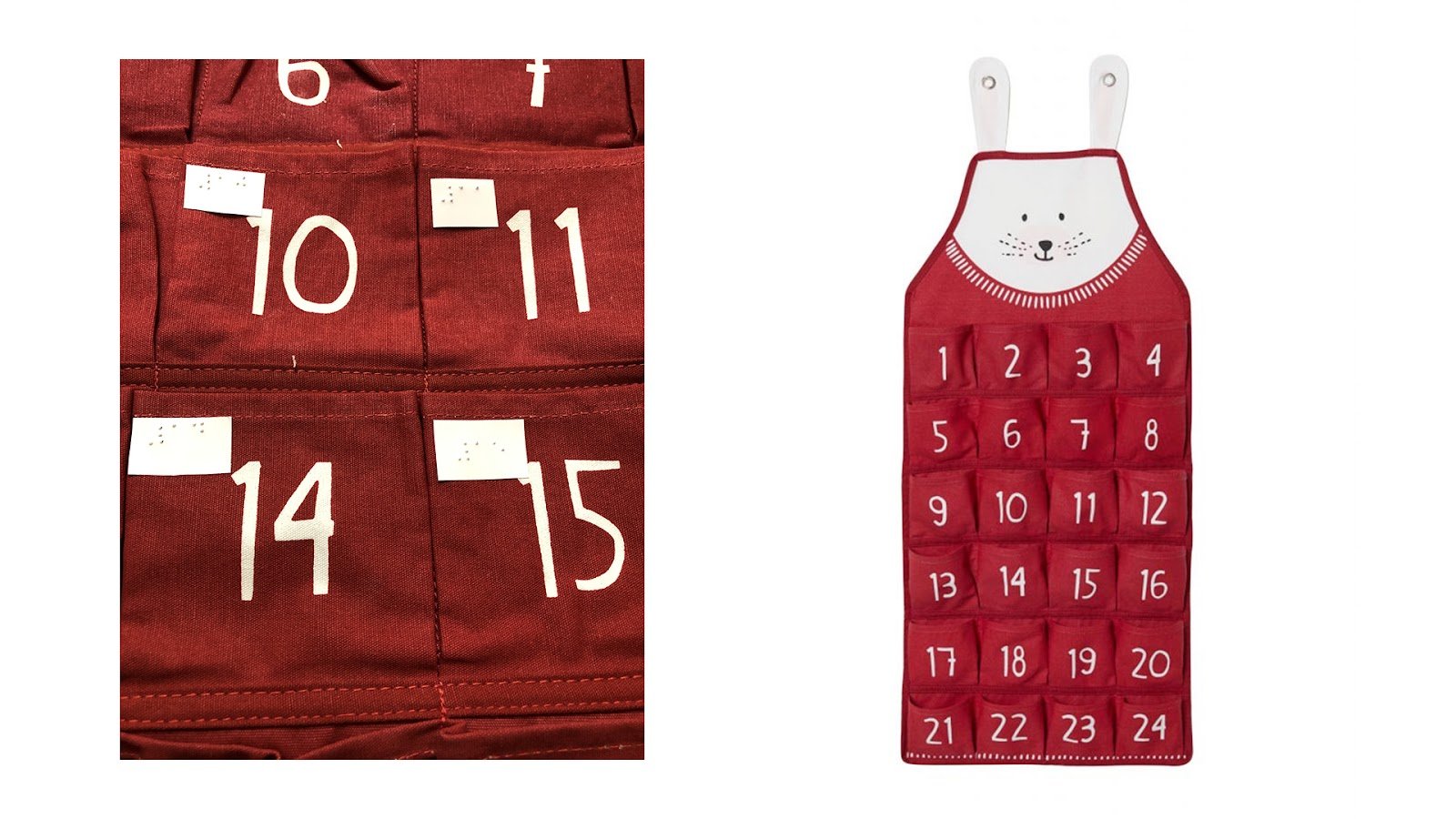 Тифлокомментарий: две цветные фотографии. Слева фрагмент красного адвент-календаря из ткани, на каждом кармашке в центре белая цифра, а в левом верхнем углу приклеен белый стикер с цифрой, написанной шрифтом Брайля. Справа адвент-календарь целиком. На прямоугольник из красной ткани нашиты 24 квадратных кармашка с белыми цифрами них. В верхней части календаря нарисована мордочка зайца, а пришитые уши выполняют функцию подвеса.