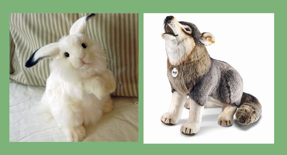 Тифлокомментарий: коллаж. Две цветные фотографии мягких игрушек на зеленом фоне. На фото слева пушистый белый кролик. Он сидит на задних лапах, подняв передние лапы к груди. Длинные уши с черными кончиками торчат в стороны. Справа собака породы типа хаски или волк. Пес сидит, обернувшись пушистым хвостом. Он задрал голову вверх, словно воет. Короткая шерсть на хвосте, туловище и макушке коричневая, а лапах, морде и шее светлая. Обе игрушки выполнены реалистично.