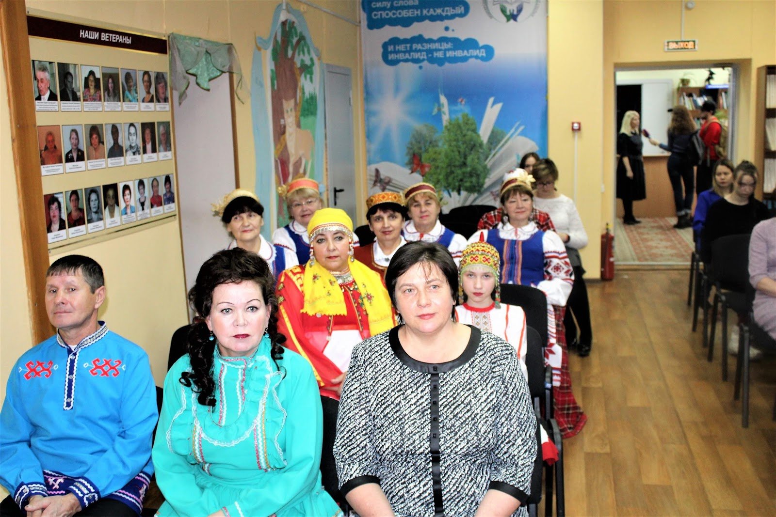 Тифлокомментарий: цветная фотография. Ряды стульев в зале библиотеки разделены проходом. Слева от него на стульях сидят люди в национальных костюмах, справа — люди в повседневной одежде. Все смотрят вперед на выступающего. На стене зала доска с фотографиями пожилых людей, наверху текст: «Наши ветераны». На заднем плане в холле библиотеки блондинка в черном платье дает интервью телевизионным журналистам.