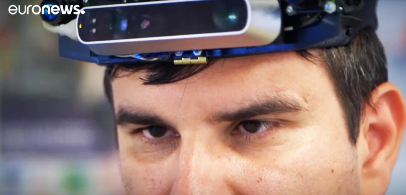 Тифлокомментарий: цветная фотография. Верхняя половина мужского лица на размытом фоне. Глаза мужчины карие, взгляд расфокусирован, брови густые, на темных с проседью волосах короткая стрижка. На лбу мужчины зафиксирован прибор, похожий на прибор ночного видения или виртуальные очки. Его корпус серебряного цвета снабжен камерой и застеклен, он него за голову тянутся провода.