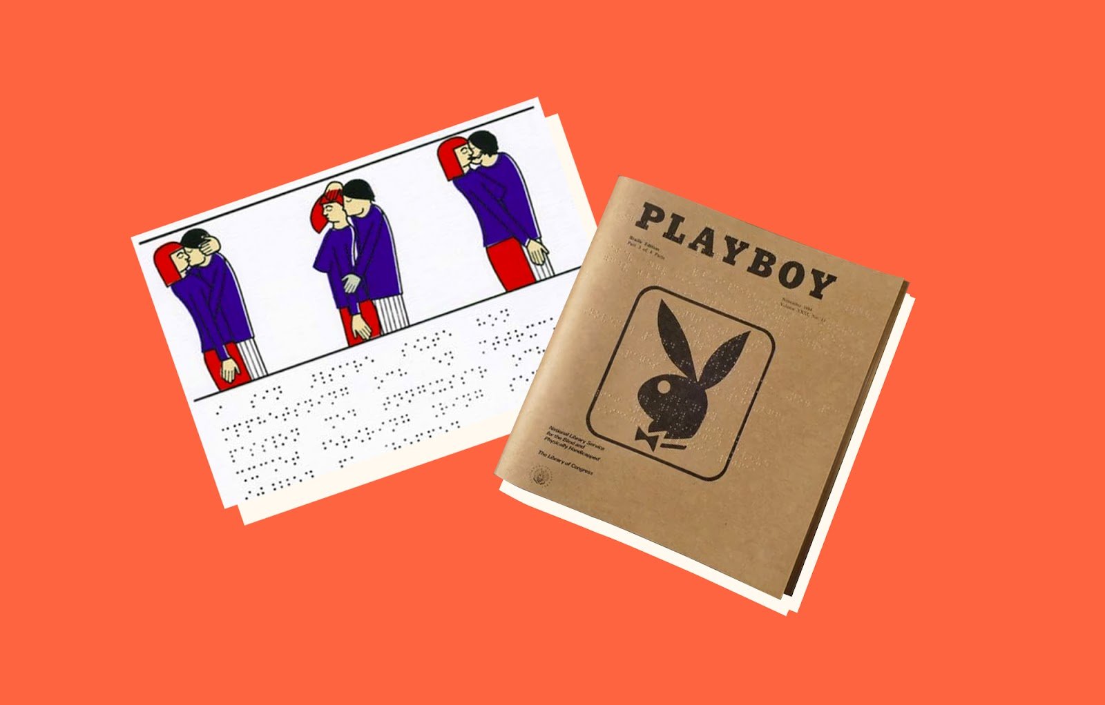 Тифлокомментарий: цветной коллаж. На красном фоне две цветные фотографии. Слева иллюстрация из тактильной книги о сексе для незрячих, справа номер журнала Playboy на Брайле. Эта версия журнала квадратной формы, с обложкой из коричневой бумаги. На обложке черным цветом написано слово Playboy, под ним знаменитый логотип журнала в виде профиля зайчика с галстуком-бабочкой, заключенного в квадрат. Иллюстрация из книги содержит картинку с тремя позами одной целующейся пары и абзац текста на Брайле. Мужчина и женщина целуются, стоя друг напротив друга. Слева мужчина прижимает женщину к себе, а она положила руку ему на затылок. В центре женщина стоит, прижавшись к мужчине спиной, он целует ее в шею. Справа пара снова целуется и держится за руки.