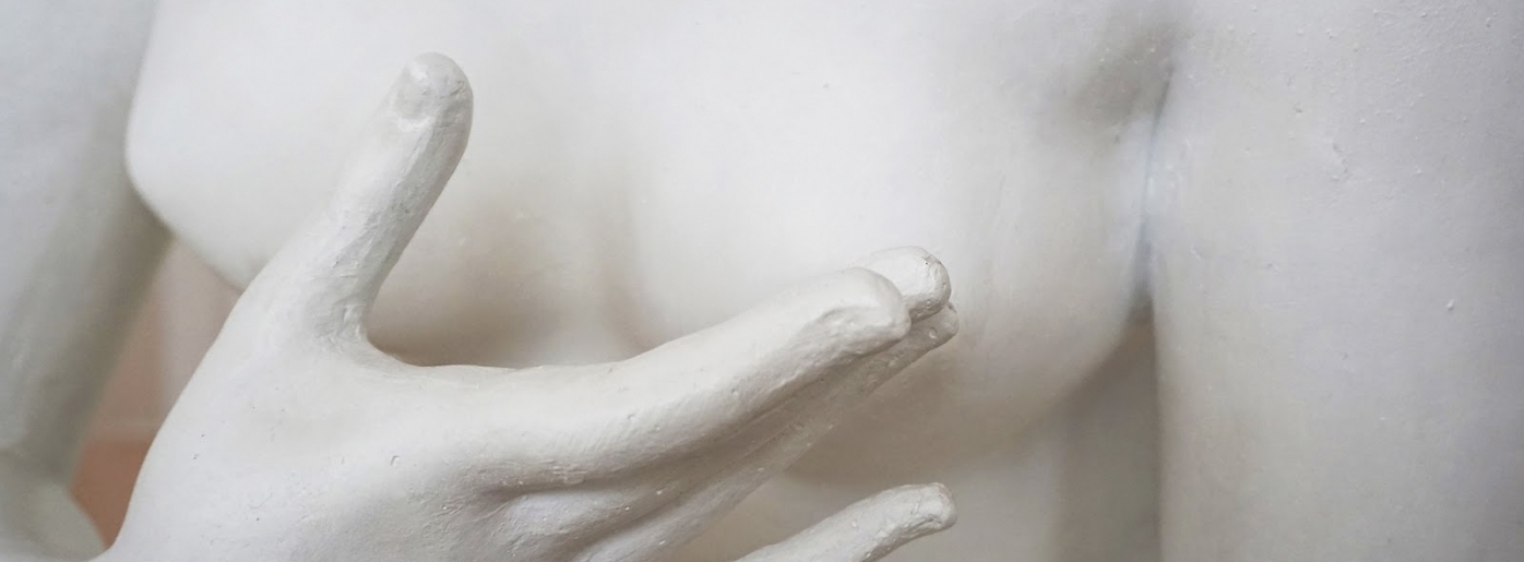 Тифлокомментарий: черно-белая фотография. Фрагмент белой мраморной скульптуры. Мужские руки обхватили и сжимают обнаженную девушку. Пальцы впиваются в талию и бедро девушки с такой силой, что кажется, будто это мягкое и живое и женское тело, а не твердый камень.