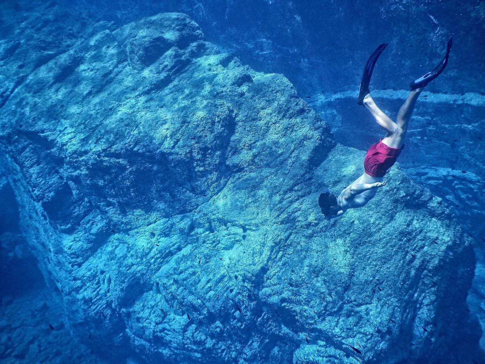 Тифлокомментарий: цветная фотография, подводная съемка. На глубине водоема, рядом со скалами проплывает ныряльщик. Мужчина в маске, плавательных шортах и ластах.