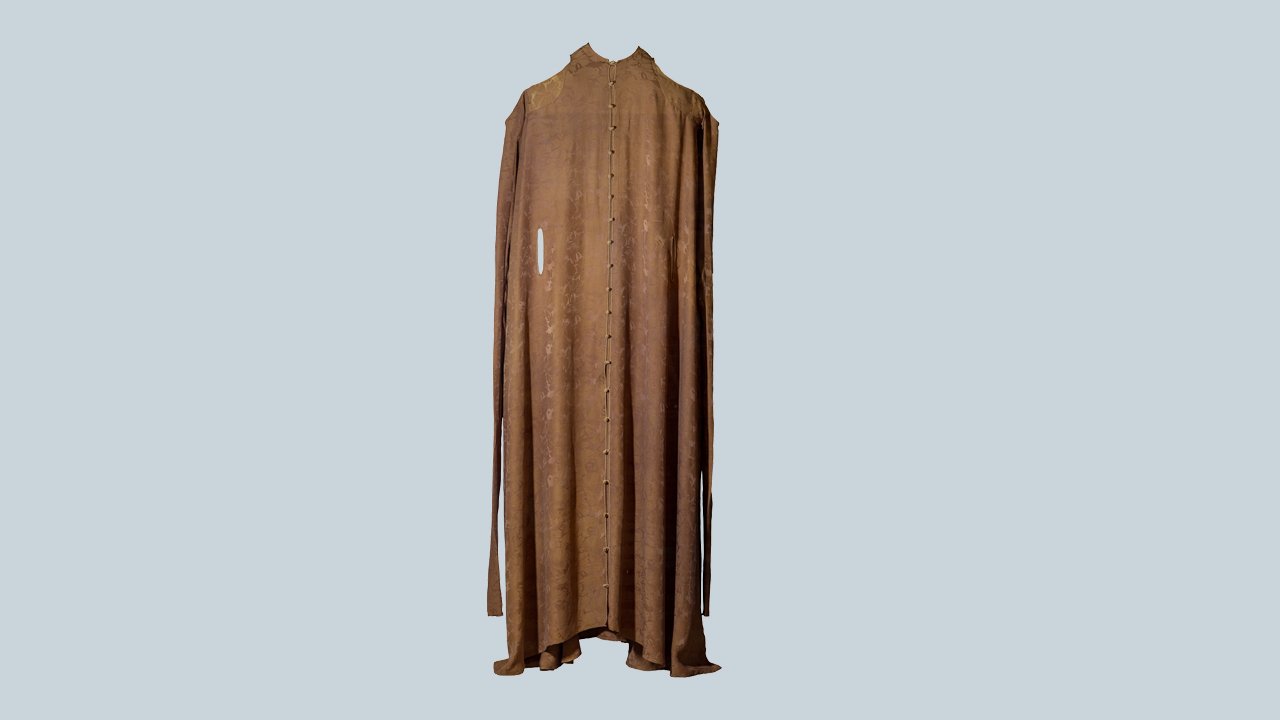 Тифлокомментарий: цветная фотография. На сером фоне коричневая телогрея — прямая, длинная широкая женская верхняя одежда. Ткань легкая с едва просматривающимся декоративным узором. Сверху донизу застежка на пуговицах, похожих на узелки. Декоративные узкие рукава откидные, длинные, доходят до самого низа телогреи.