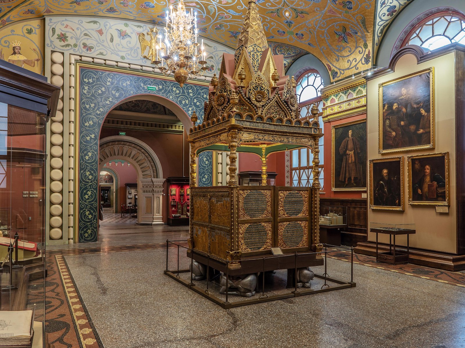 Тифлокомментарий: цветная фотография. В центре зала под высоким золотым сводом с тонким растительным голубым орнаментом стоит царское моленное место. Квадратное деревянное основание с золотыми барельефами и золоченой росписью на четырех ножках серебряного цвета в виде фантастических хищных зверей, похожих на младенцев, упавших на колени и склонивших головы к земле. Верхняя часть моленного места представляет собой многоуровневый остроконечный шатер богато украшенный золотой резьбой на четырех фигурных столбцах. На стенах висят картины в золоченых рамах с изображениями бояр.