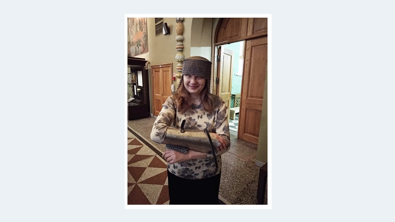 Тифлокомментарий: цветная фотография в белой рамке на сером фоне. В зале Исторического музея стоит женщина в черной юбке и бежевой кофте с коричневым крупным цветочным узором. Руки держит вместе перед собой, как за партой. На правой руке железная накладка золотистого цвета до локтя с двумя черными ремешками. На голове металлический шлем-мисюрка, закрывающий верхнюю часть головы, к его краям прикреплена кольчужная бармица, защищающая шею. У женщины русые волосы чуть ниже плеч, легкая улыбка.