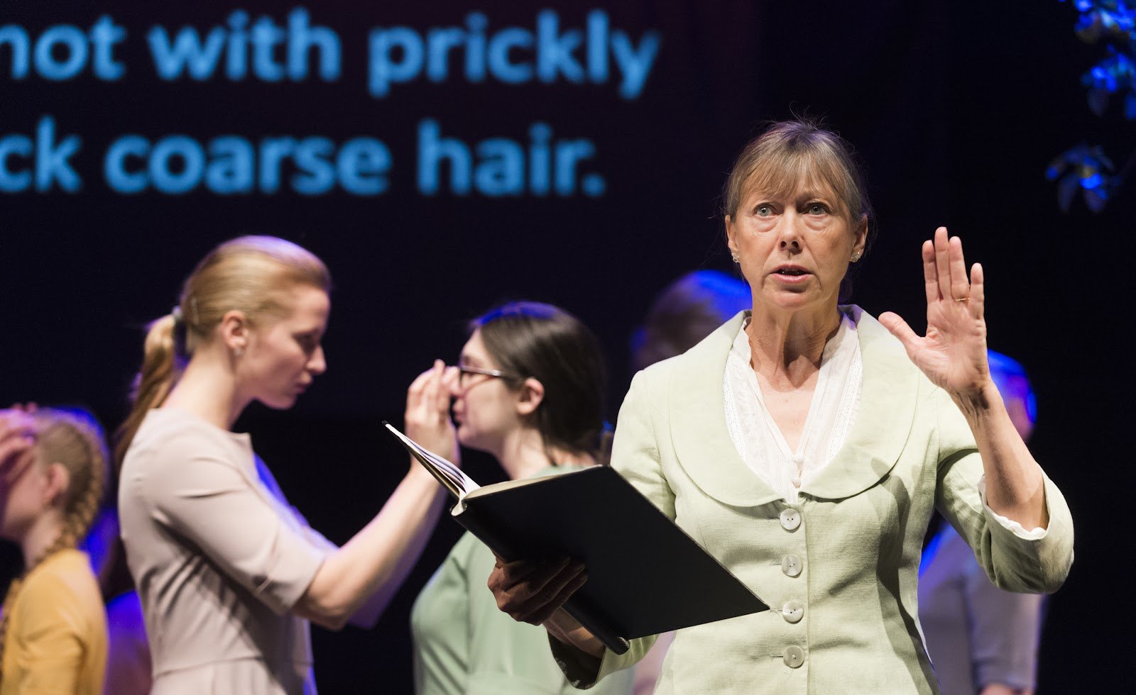 Тифлокомментарий: сцена из спектакля. На переднем плане женщина средних лет в светло-зеленом пиджаке и белой блузке подняла левую руку на уровне шеи, ладонью к зрителям. В правой руке она держит черную книгу формата А4. За ней стоят несколько пар женщин. Они лицом повернуты друг к другу. И одна из пары прикасается к лицу другой. За актерами на черном экране светятся голубым английские буквы.
