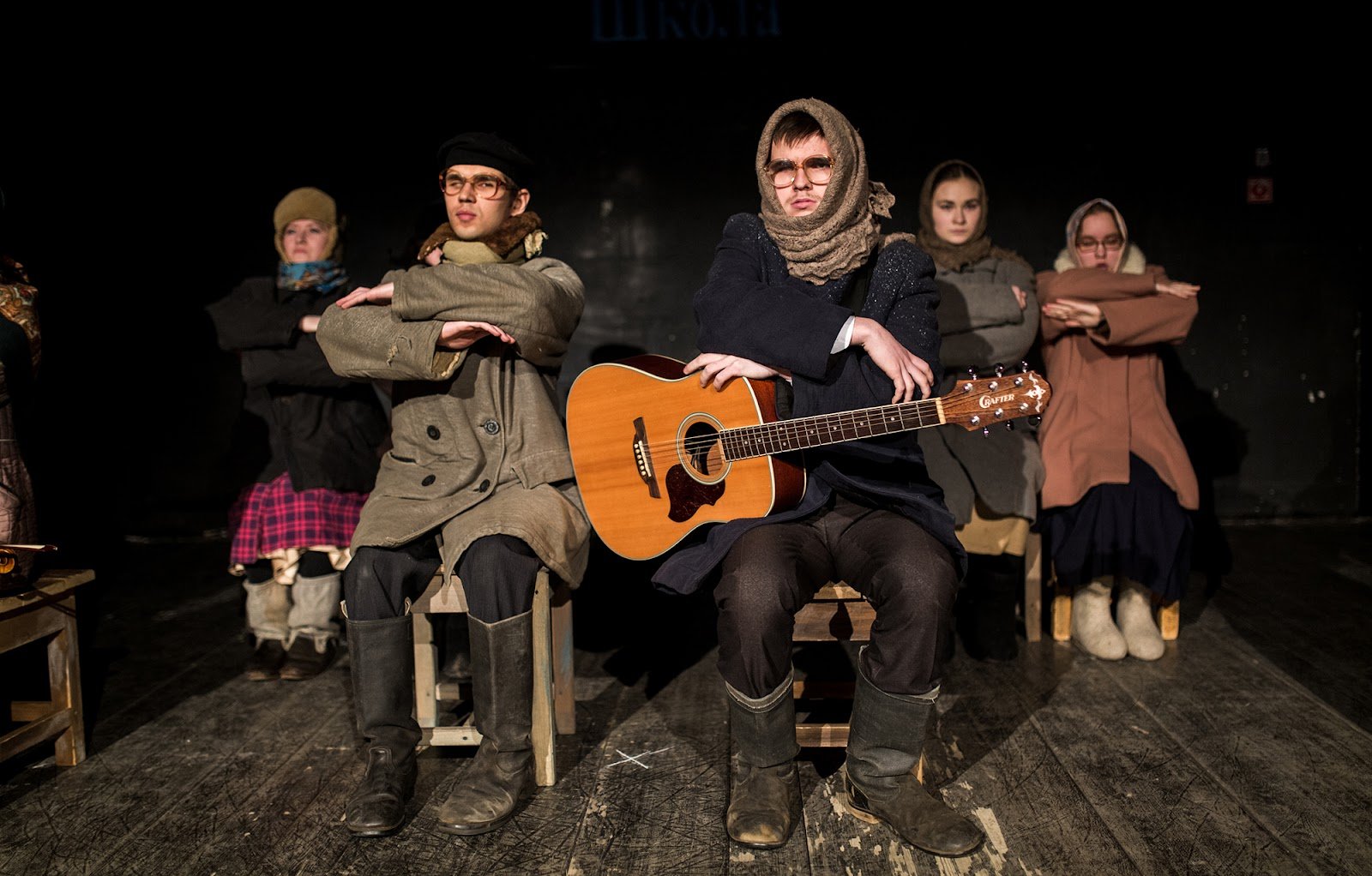 Тифлокомментарий: сцена из спектакля. На переднем плане два молодых человека. Оба в очках. В руках одного гитара. Сзади три девушки. Все актеры одеты по зимнему: шапки, шарфы, пальто, сапоги, валенки. Все сидят на деревянных стульях и держат замкнутые руки на уровне груди как дети за партой.