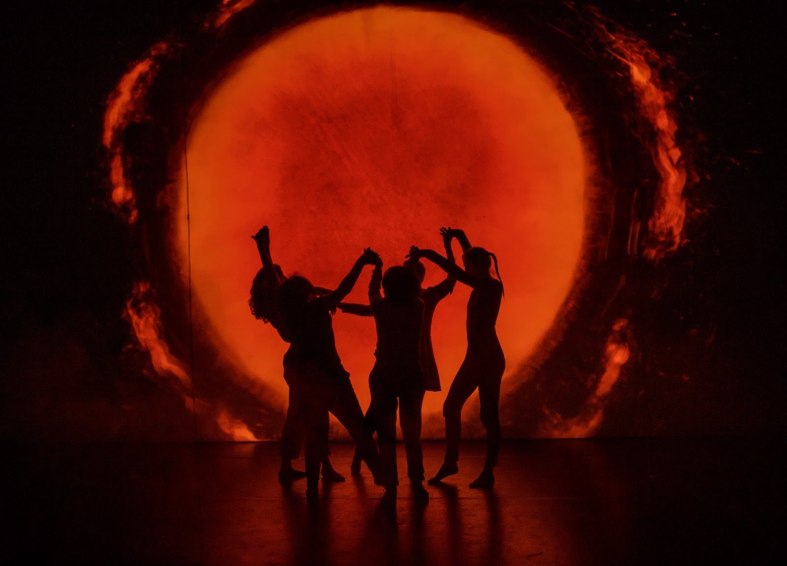 Тифлокомментарий: сцена из спектакля. На фоне ярко-красного круга размером с пола до потолка силуэты пятерых человек, которые босиком стоят в хороводе, высоко подняв руки над головой.