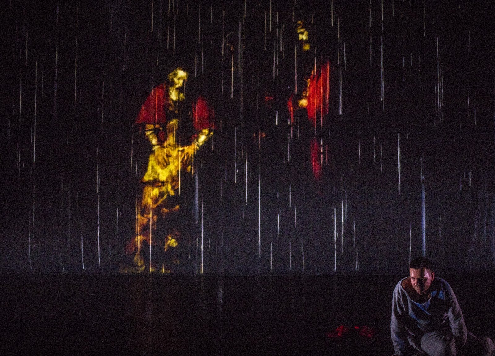 Тифлокомментарий: сцена из спектакля. С правой стороны сцены сидит на коленях мужчина в свободной футболке и штанах. За ним вся стена занята изображением картины Рембрандта «Возвращение блудного сына». На ней молодой человек обнимает ноги своего пожилого отца, стоя перед ним на коленях. Справа стоит бородатый мужчина с поникшей головой. Картина написана в красно-желтой цветовой гамме. Все изображение покрыто тонкими вертикальными линиями, похожими на дождь.