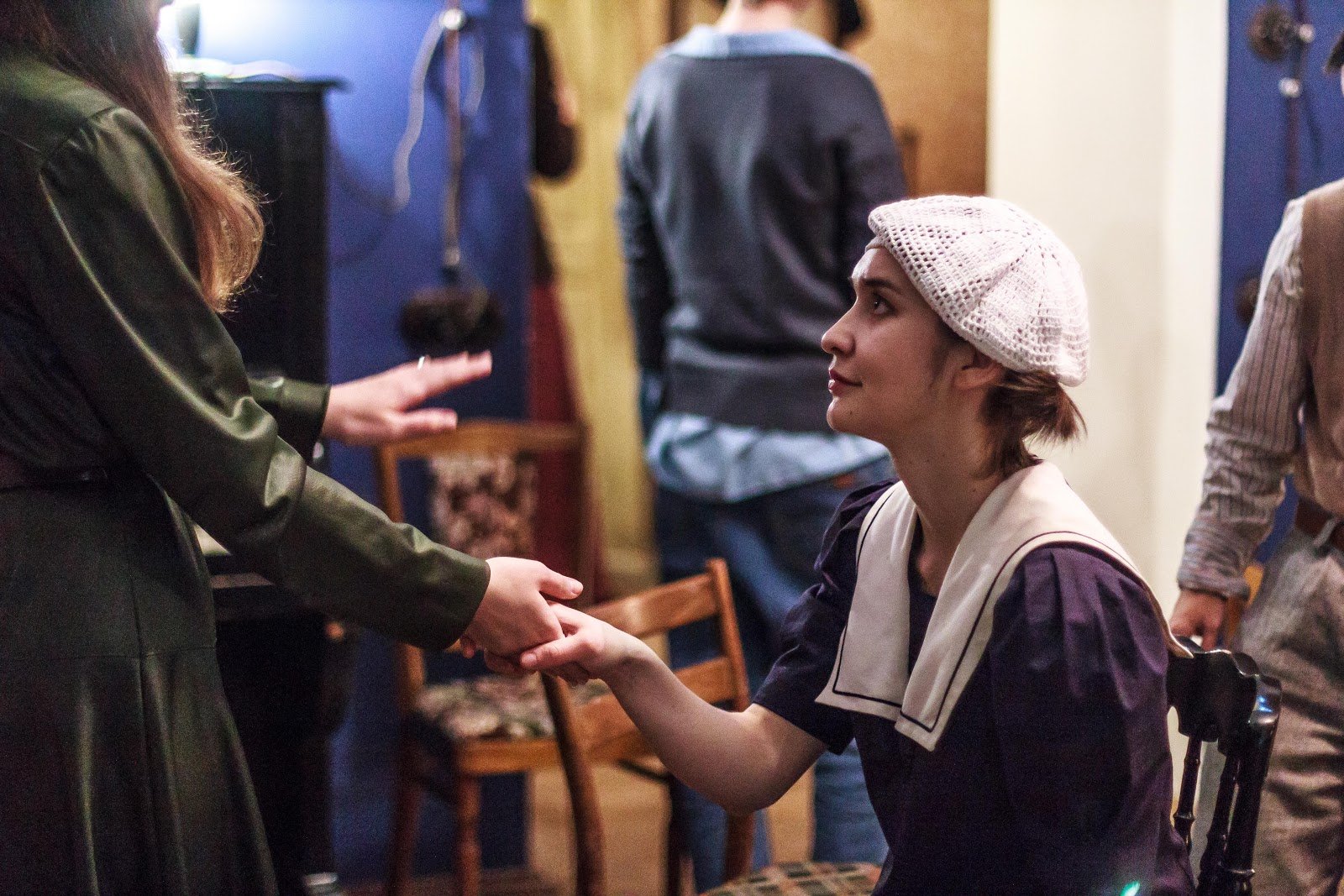 Тифлокомментарий: посреди комнаты с мебелью и людьми на резном стуле сидит девушка в белом вязаном берете, темно-фиолетовом платье с большим белым воротником. Она держит за руку стоящую перед ней женщину в зеленом платье с распущенными волосами и внимательно смотрит на нее, слегка улыбаясь.