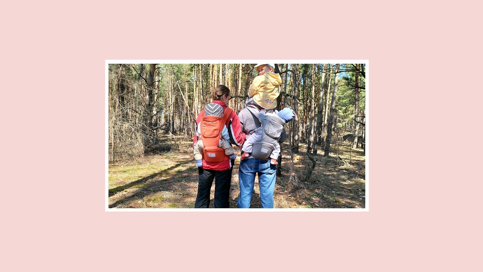 Тифлокомментарий: цветная фотография на розовом фоне. В ясный летний день по сосновому лесу идет семья Анисимовых с тремя детьми. Слева Екатерина несет в красном эрго-рюкзаке за спиной младенца. Справа от Екатерины Александр так же несет младенца в сером рюкзаке, на плечах у него сидит третий ребенок около двух лет. Екатерина держит супруга под руку. Александр одет в джинсы и серую толстовку, Екатерина в черных штанах и красной куртке, ее каштановые волосы собраны на затылке.