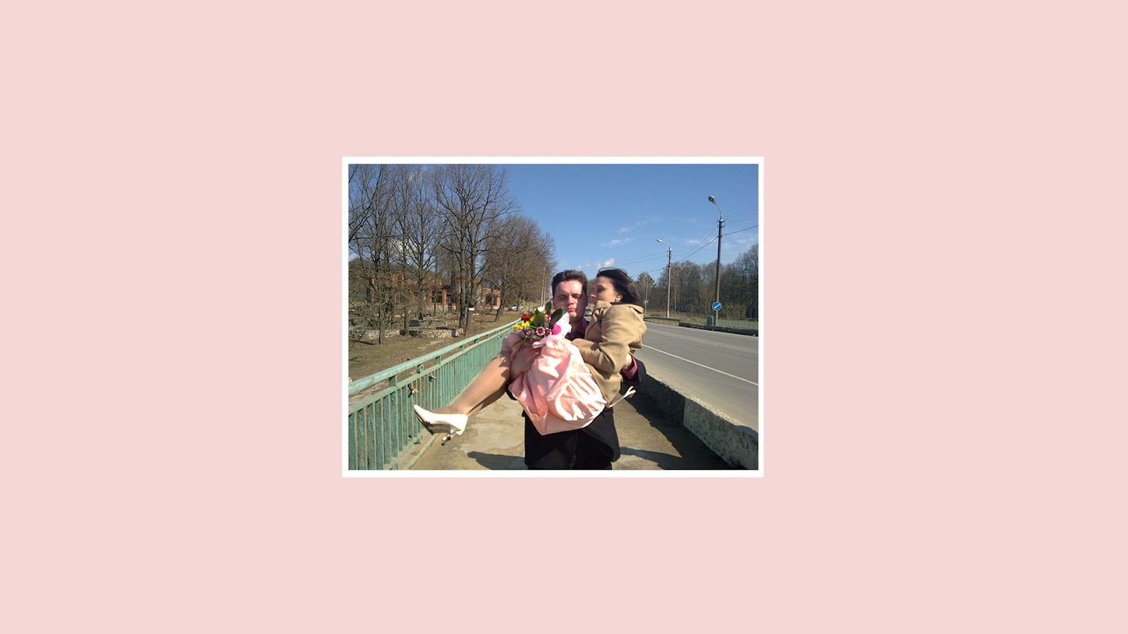 Тифлокомментарий: цветная фотография на розовом фоне. Борис несет Елену на руках через мост, у Елены в руках свадебный букет из розовых и желтых цветов. Борис одет в черный костюм, Елена — в розовое свадебное платье по колено с пышной юбкой и в бежевое полупальто, на ногах у нее белые туфли-лодочки на шпильках. Над молодоженами ярко-голубое безоблачное небо, на дальнем плане аллея деревьев без листвы.