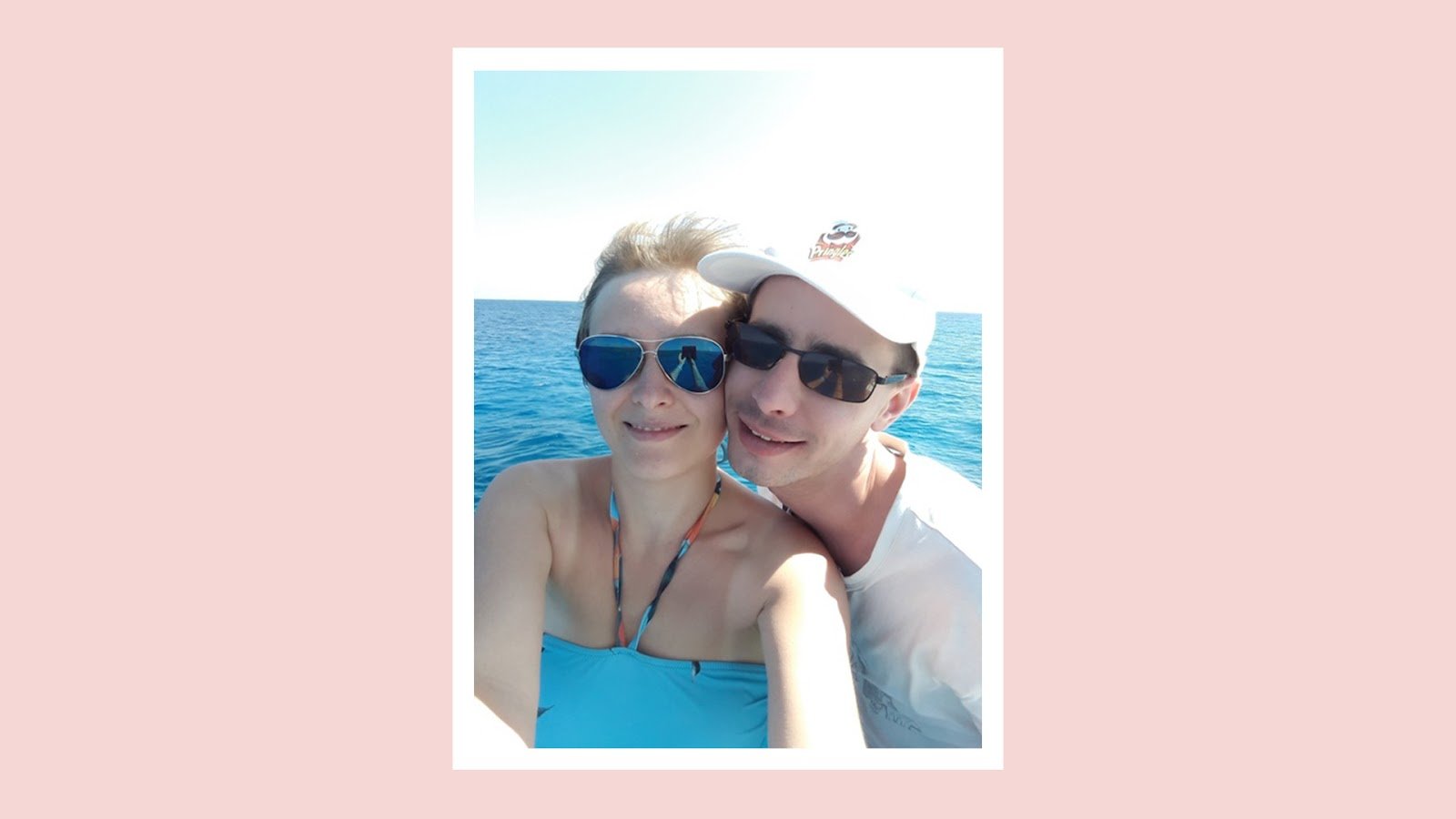 Тифлокомментарий: цветная фотография на розовом фоне. В летний ясный день Ольга с Александром делают селфи на фоне ярко-синего моря. Оба улыбаются, прижавшись щеками. Ольга одета в голубой топ, ее светлые волосы собраны на затылке, челка развевается на ветру. Она в солнцезащитных очках с синими зеркальными стеклами. Александр в белых футболке и кепке и в черных очках.