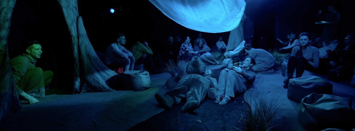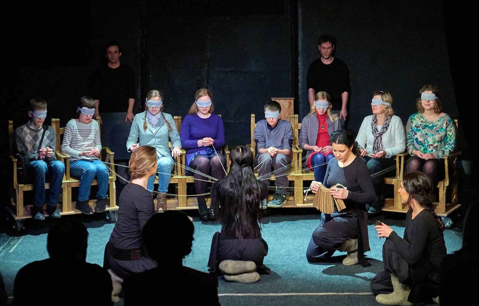 Тифлокомментарий: вид из зрительного зала. В центре сцены стоят полукругом восемь деревянных кресел. На них лицом к зрителям сидят взрослые и дети. Они одеты современно, буднично. У всех завязаны глаза, и каждый держится за конец своей веревки. Противоположные концы веревок держит девушка в черном. Она сидит на полу напротив людей в креслах, спиной к зрителям. Ее длинные, темные волосы распущены. Справа и слева от нее — еще трое молодых девушек в черном. Одна из девушек держит в руках деревянную трещотку. У всех четверых на ногах валенки.