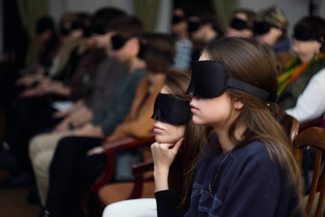 Тифлокомментарий: зрительный зал на спектакле-невидимке. Все кресла заняты зрителями, у которых глаза закрыты черными повязками. На переднем плане две юные девушки внимательно прислушиваются к происходящему. Одна подпирает подбородок рукой.
